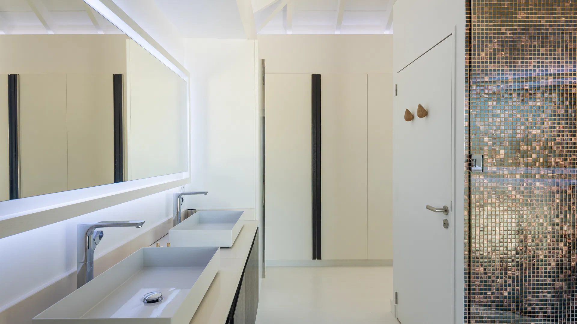 These three suites have king beds and calm, elegant furnishings that draw attention to the view. Twin beds in the fourth bedroom, which is located on the lower level close to the pool, make it ideal for kids, teens, or friends to share. No matter where you sleep, the ocean is there when you wake up, framed by light and glass.