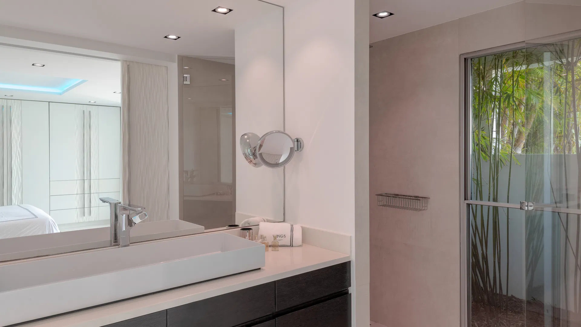 The rhythm of the villa starts on the main level. With luxurious couches and sophisticated armchairs arranged so that conversation always takes place while facing the sea, a large, open-plan living room greets you. The tropical breeze blows through the room when the doors are open, and the sound of the island seems far away. An air-conditioned TV room is close by if you want a cooler, darker haven.