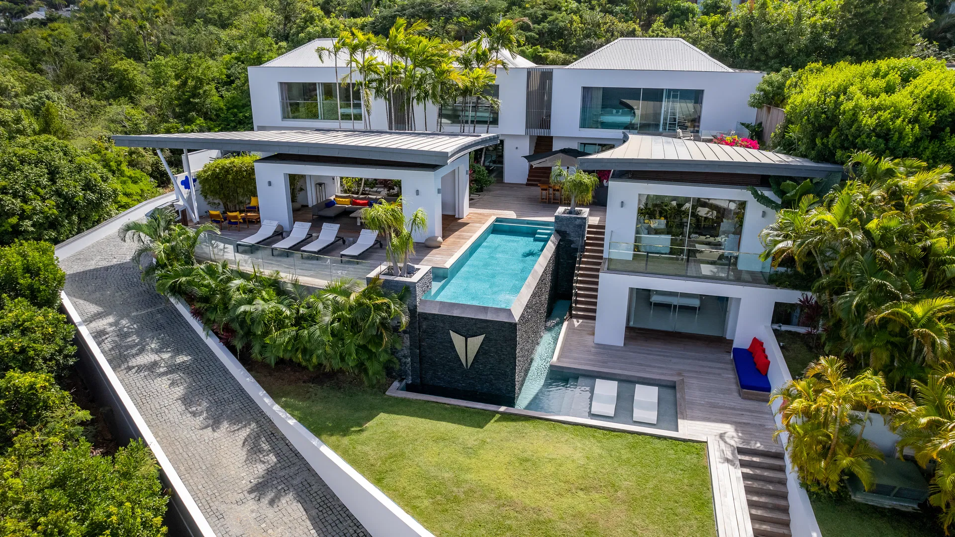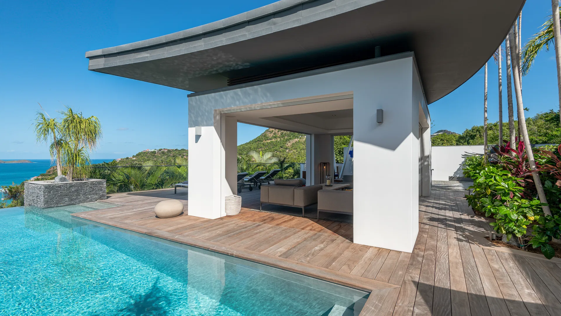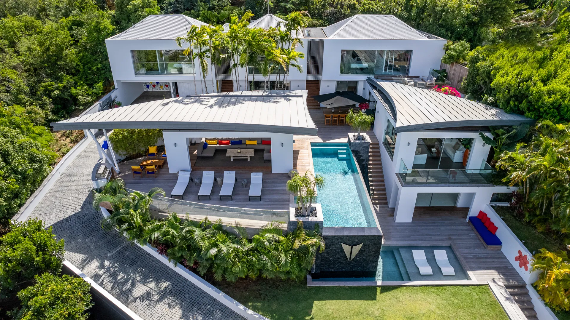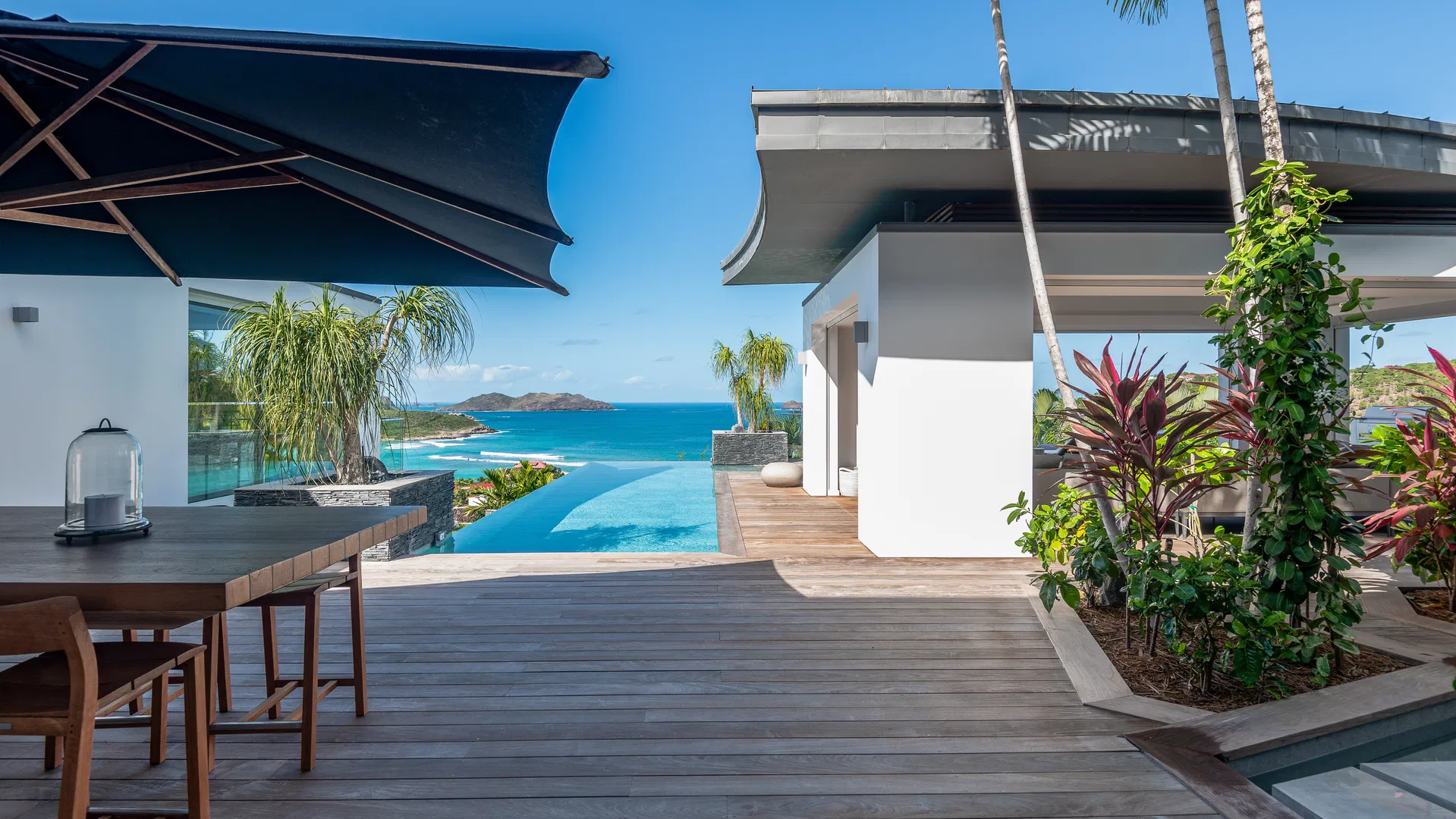 Villa Wings is unique among St Barts villas due to its wing-shaped architecture, unique two-level terrace concept with an infinity pool and a second shallow pool, and bedroom arrangement that offers genuine seclusion while keeping each suite facing the ocean.