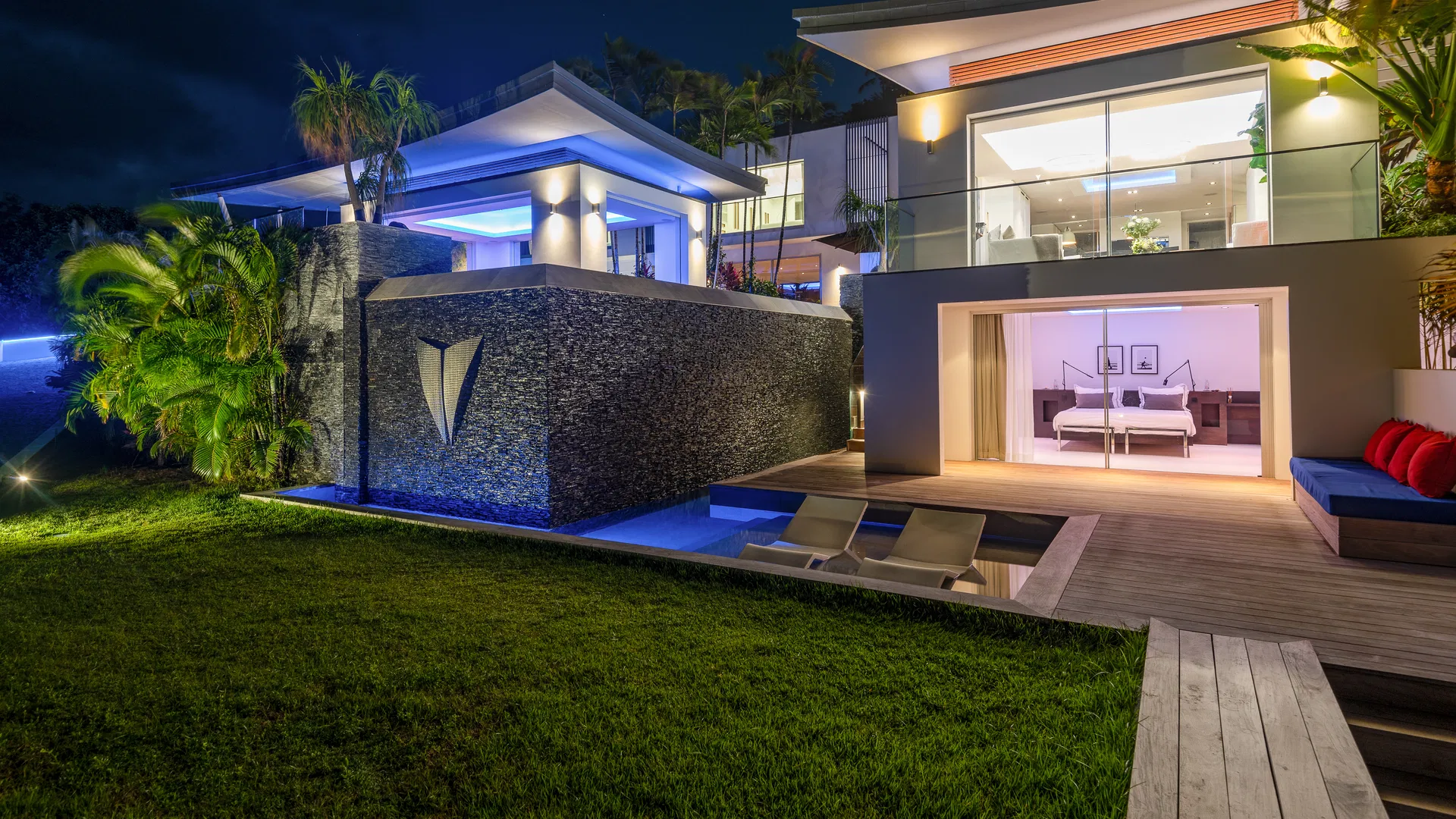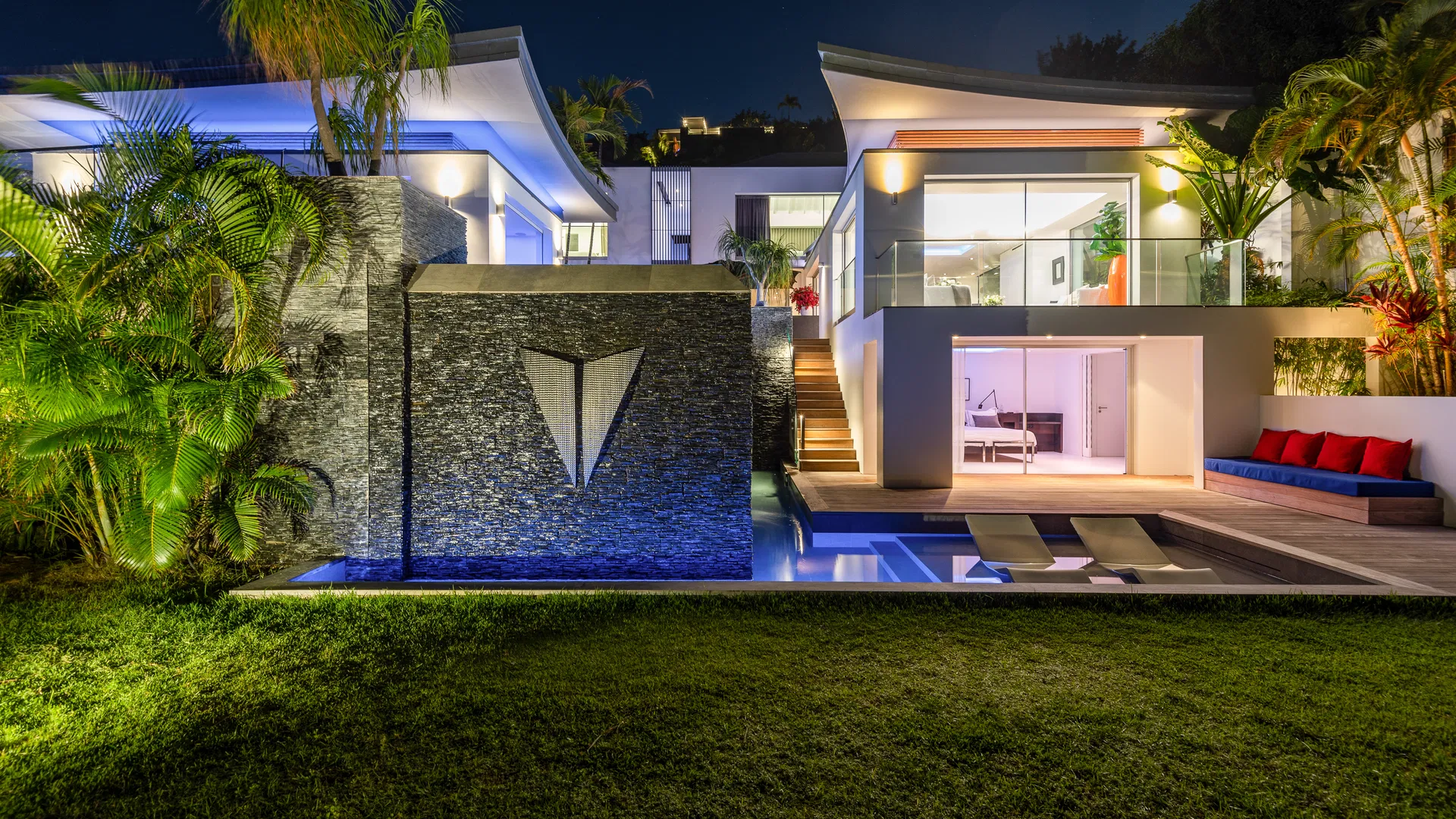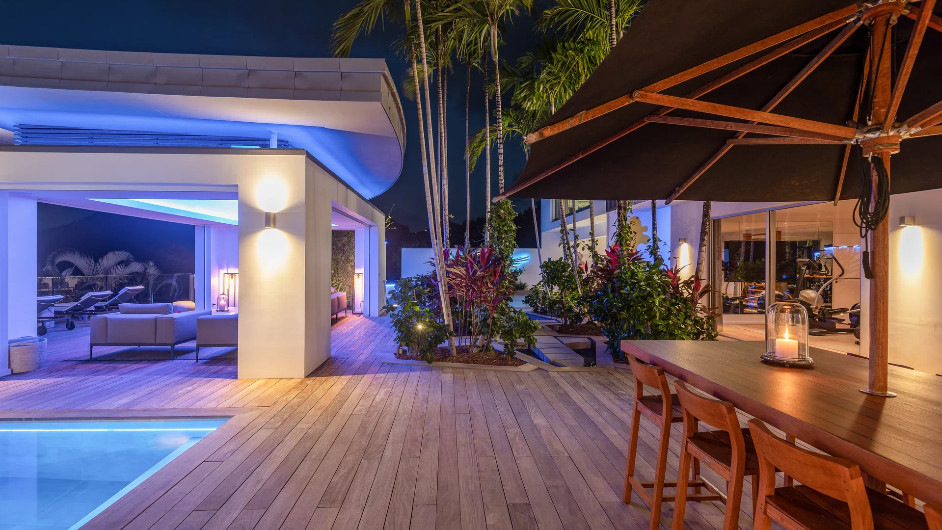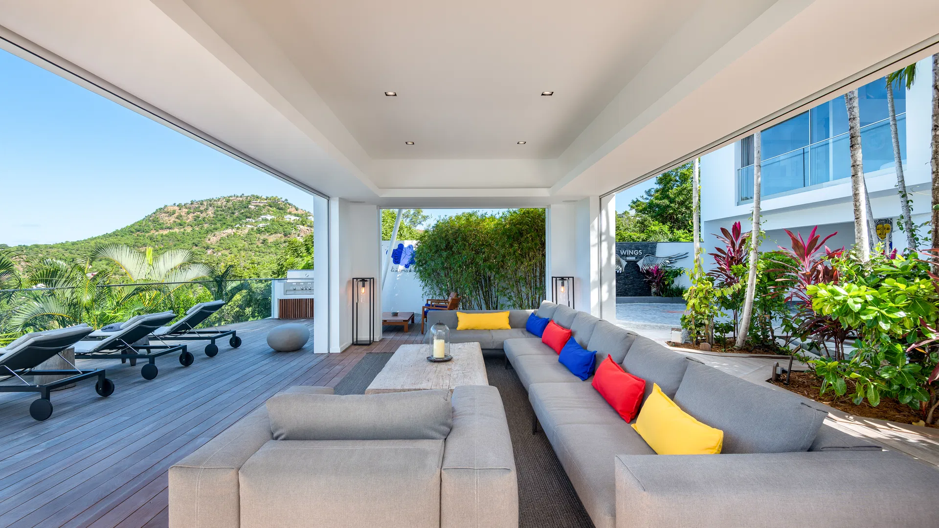 Villa Wings transforms outdoors into a two-story terrace haven that resembles a private resort perched above the water. Couches and lounge chairs are arranged for extended periods of sun, shade, and unobstructed views on both terrace levels.