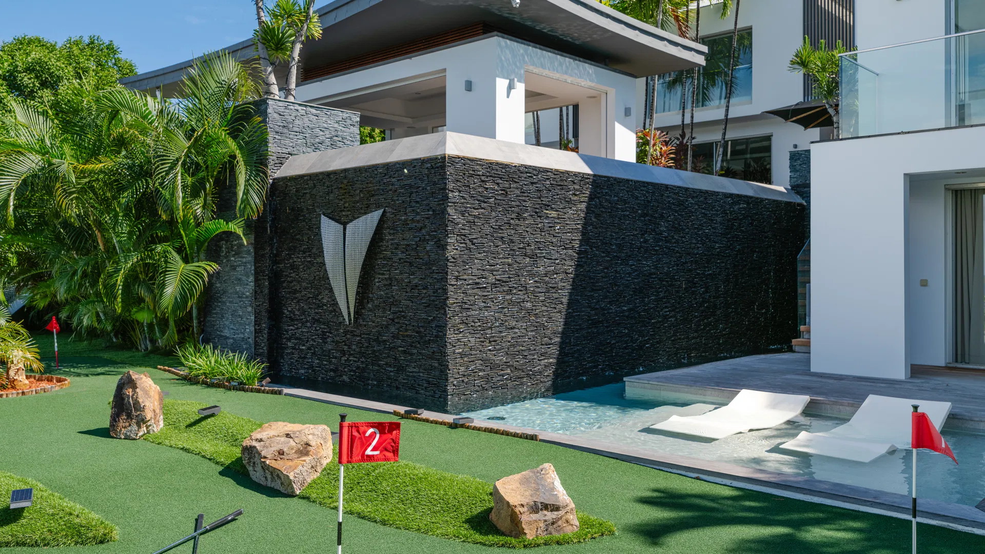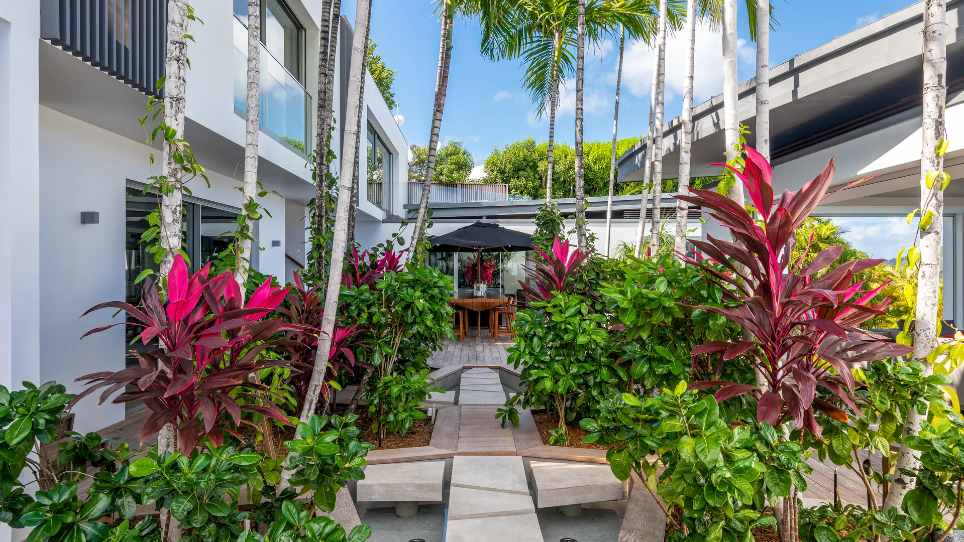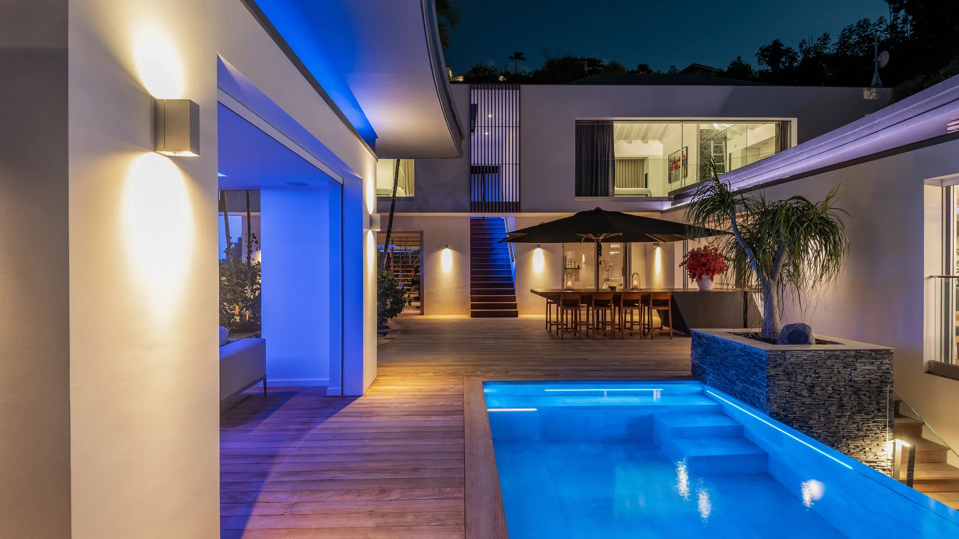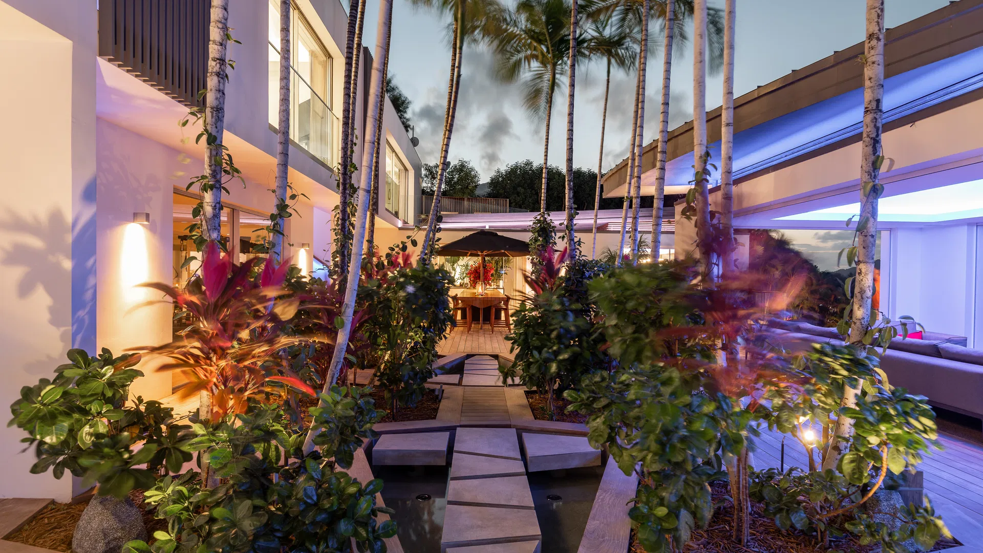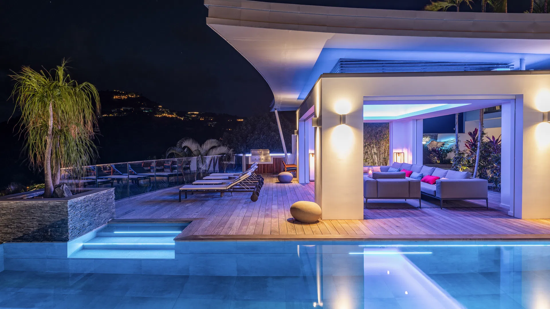Villa Wings transforms outdoors into a two-story terrace haven that resembles a private resort perched above the water. Couches and lounge chairs are arranged for extended periods of sun, shade, and unobstructed views on both terrace levels.