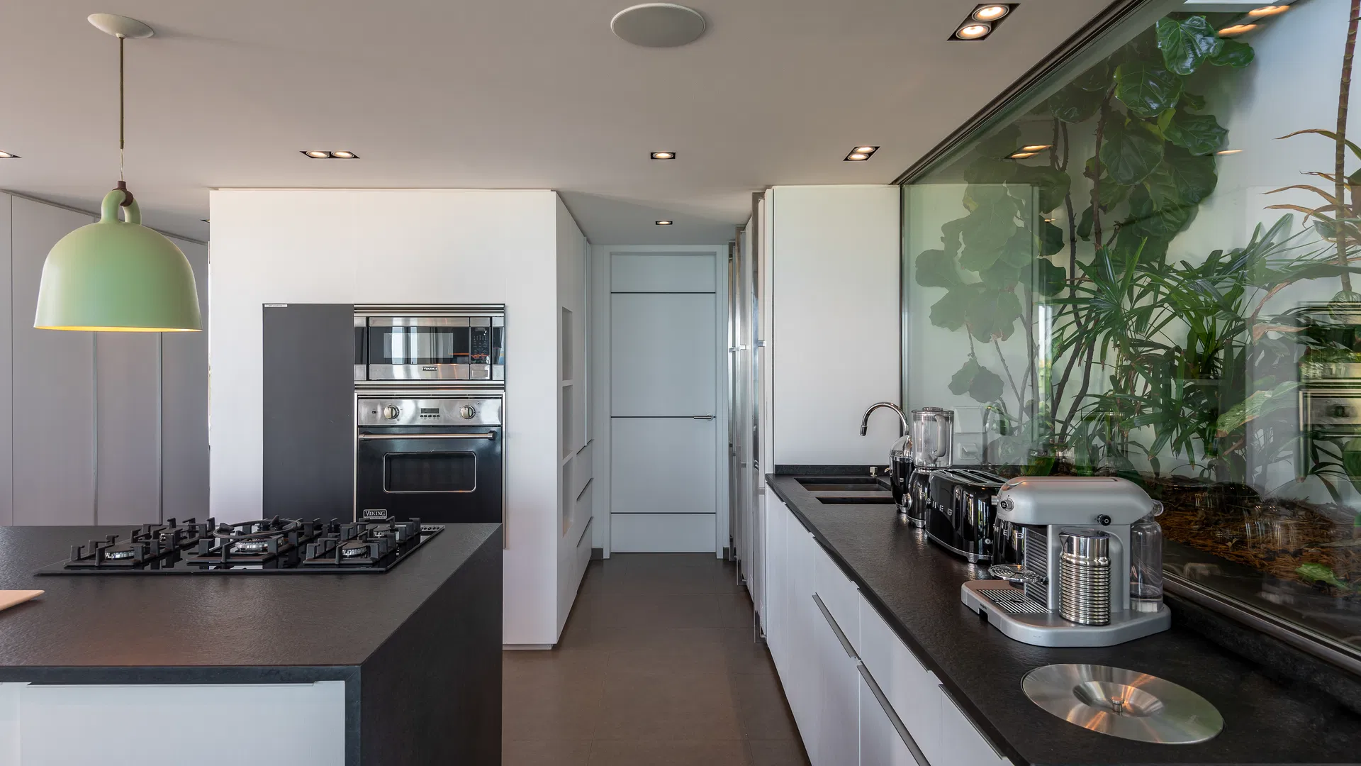 It’s ideal for quiet afternoons after a day at the beach or movie nights. The kitchen, which is anchored by a central island that effortlessly extends toward the outdoors, is fully furnished and designed for both casual cooking and private-chef service. There are two ways to enjoy meals: indoors in a comfortable, air-conditioned setting, or outdoors in an al fresco dining area where dinners are held under the stars and the sea is visible even as the light fades.