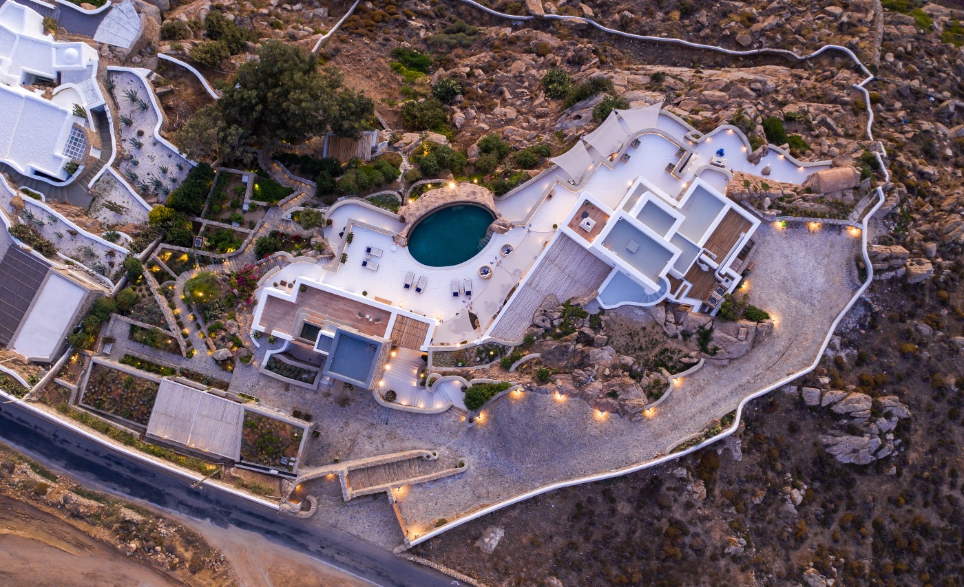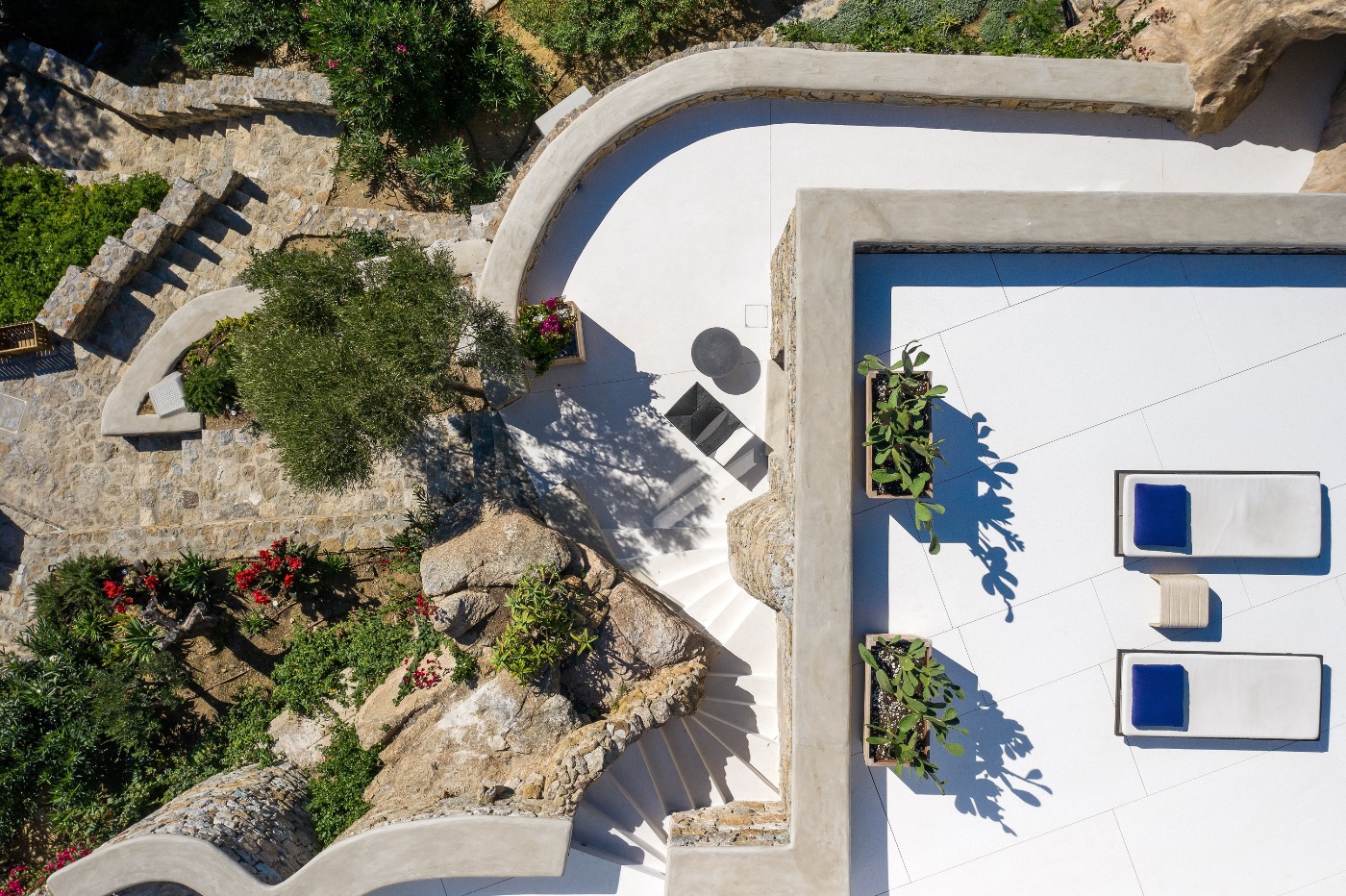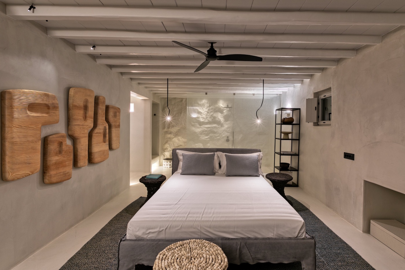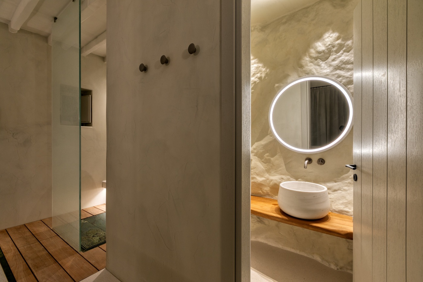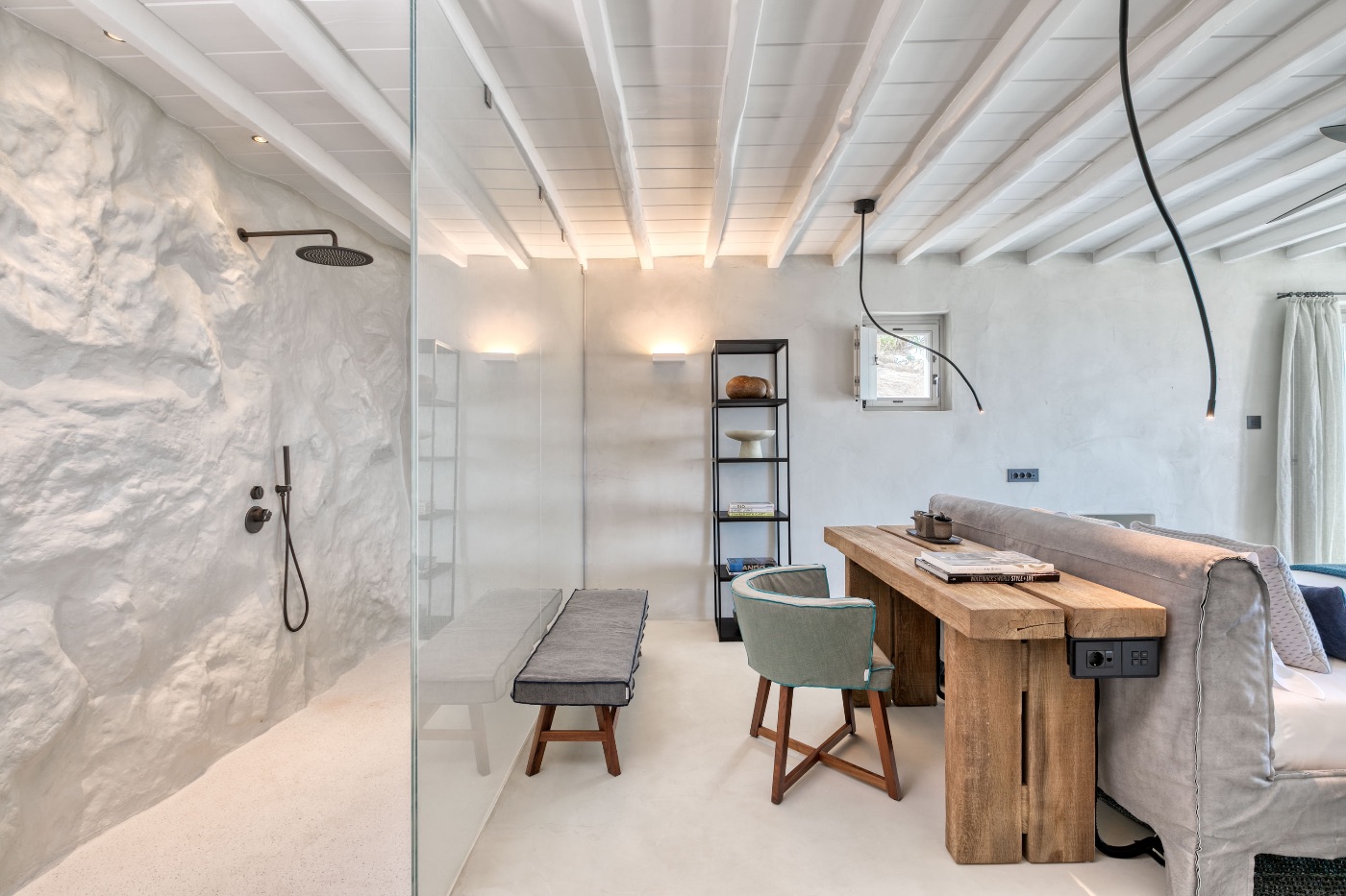 Villa Zeus expands on multiple levels. Guests enter from the highest level which hosts the parking area and leads to the upper level with the Hammam and gym facilities and the entrance to the first guest room (“Syros”) which features a mezzanine with an en suite double bedroom and a spacious wooden terrace with a built-in Jacuzzi (may be accessed from outside the bedroom too). The next level down (main/pool level) hosts the main outdoor area with the Infinity pool, the pool bar, a pool bathroom facility (shower and toilet) and the 2 main accommodation units on the left and right of the pool. The first unit hosts the kitchen and main living and dining area on the ground floor and 1 double bedroom (“Naxos”) on the first floor. Behind this unit is the Chef’s kitchen and staff facilities. The second unit hosts 2 double bedrooms (“Tinos” and “Andros”, optionally interconnected). Descending to the lower level, guests may find the bio garden on the left and enter a cave style passage on the right which exits to the guest houses area. This area hosts 5 independent guest houses with independent entrances (“Yaros”, “Baos”, “Rhenia”, “Delos”, “Paros”), a kitchenette for the guests of this level and the chapel. All guest houses are double except “Baos” which is single. In addition, “Delos” and “Rhenia” are optionally interconnected while “Rhenia” may also be set as a quadruple with the use of 2 roll-away pull-out beds. All units enjoy unobstructed sea/sunset views.