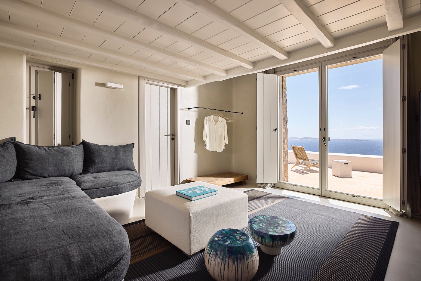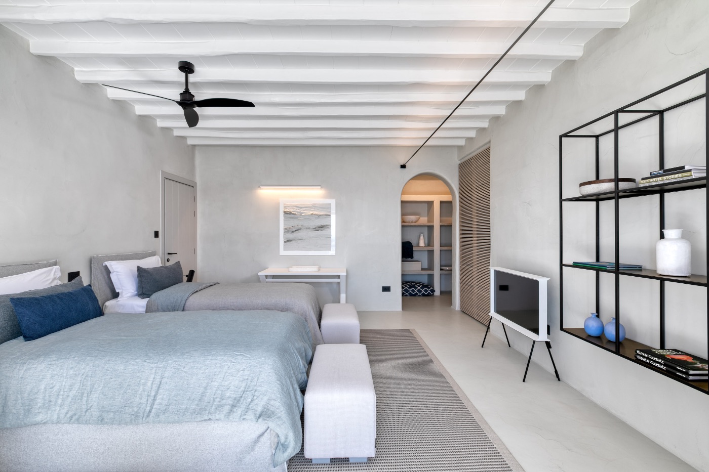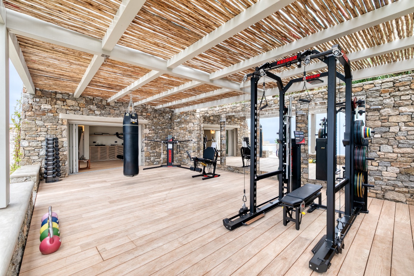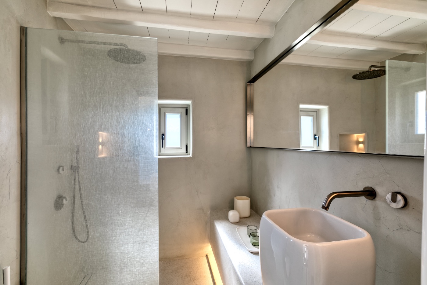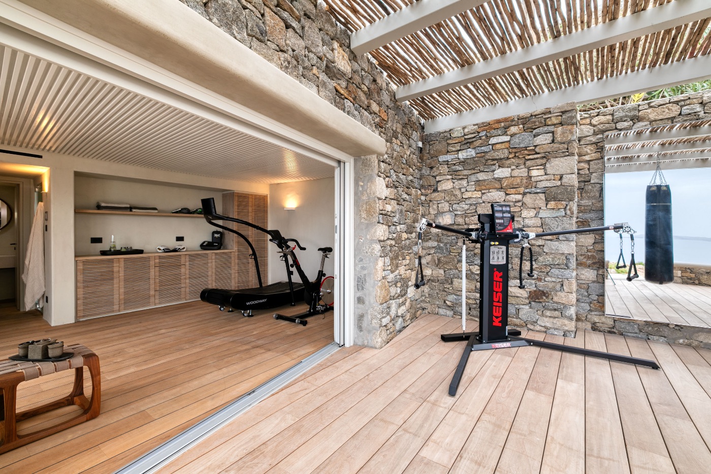 Villa Zeus expands on multiple levels. Guests enter from the highest level which hosts the parking area and leads to the upper level with the Hammam and gym facilities and the entrance to the first guest room (“Syros”) which features a mezzanine with an en suite double bedroom and a spacious wooden terrace with a built-in Jacuzzi (may be accessed from outside the bedroom too). The next level down (main/pool level) hosts the main outdoor area with the Infinity pool, the pool bar, a pool bathroom facility (shower and toilet) and the 2 main accommodation units on the left and right of the pool. The first unit hosts the kitchen and main living and dining area on the ground floor and 1 double bedroom (“Naxos”) on the first floor. Behind this unit is the Chef’s kitchen and staff facilities. The second unit hosts 2 double bedrooms (“Tinos” and “Andros”, optionally interconnected). Descending to the lower level, guests may find the bio garden on the left and enter a cave style passage on the right which exits to the guest houses area. This area hosts 5 independent guest houses with independent entrances (“Yaros”, “Baos”, “Rhenia”, “Delos”, “Paros”), a kitchenette for the guests of this level and the chapel. All guest houses are double except “Baos” which is single. In addition, “Delos” and “Rhenia” are optionally interconnected while “Rhenia” may also be set as a quadruple with the use of 2 roll-away pull-out beds. All units enjoy unobstructed sea/sunset views.