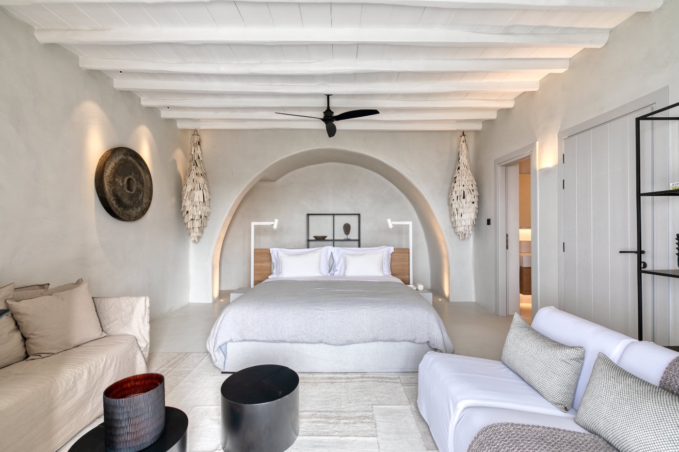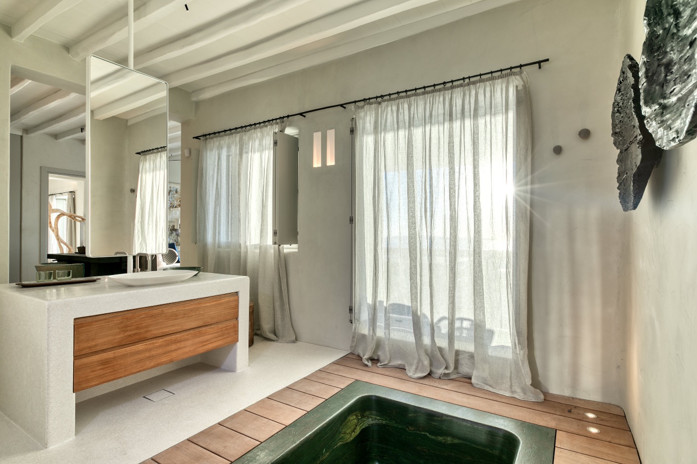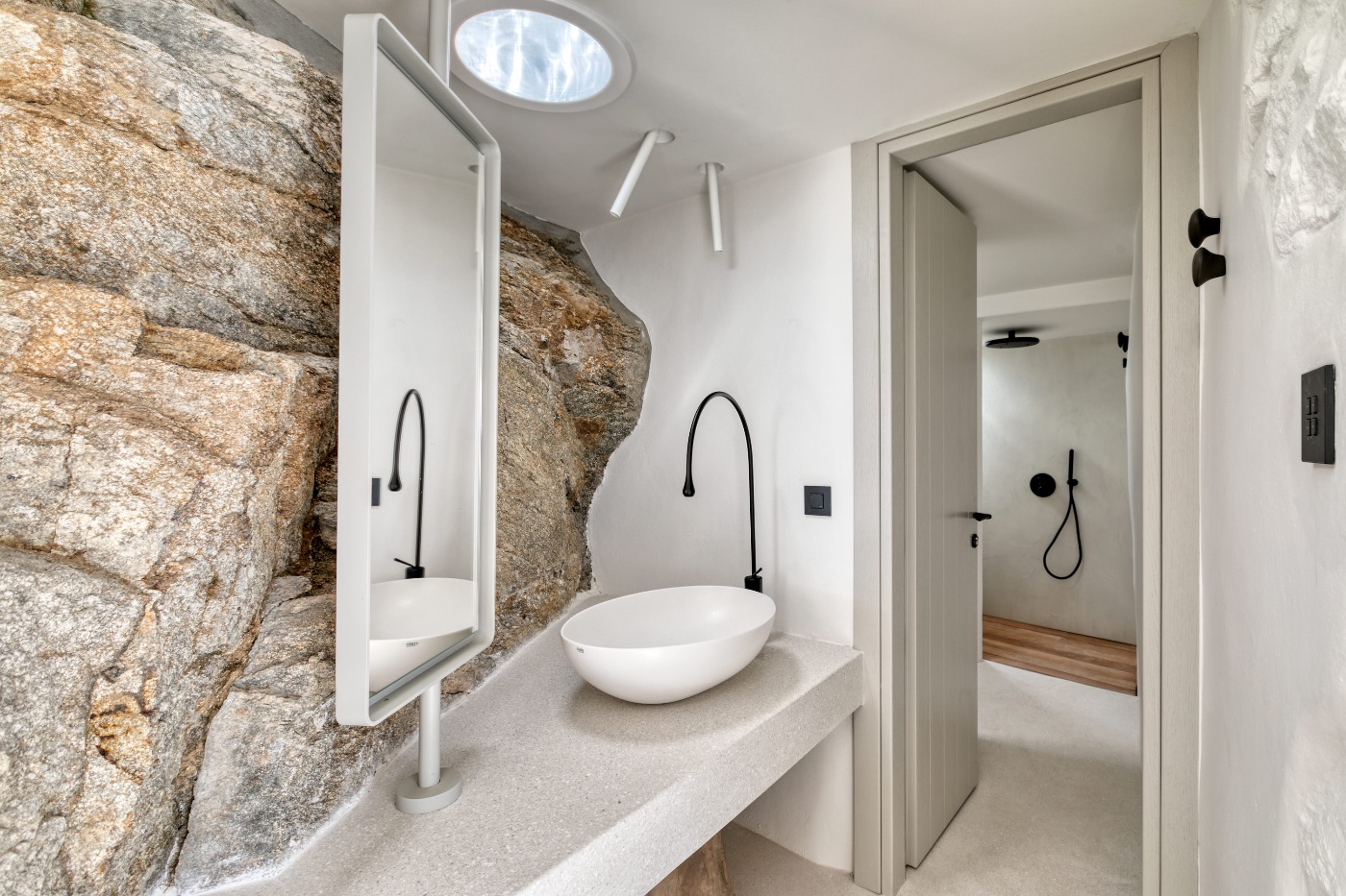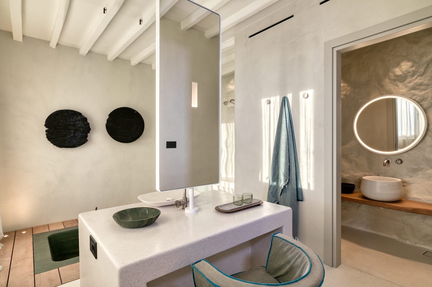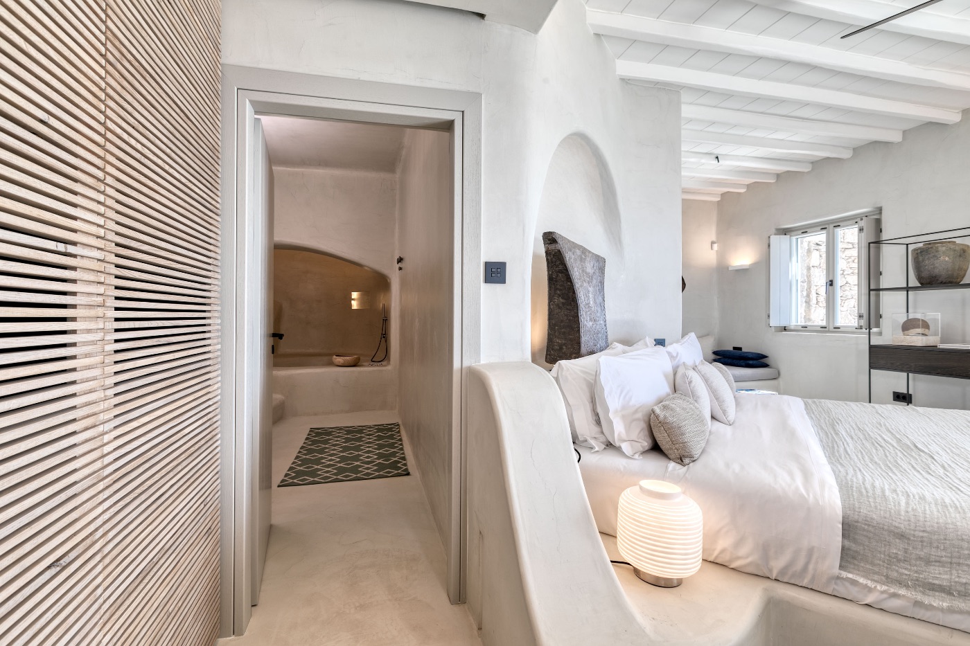 Villa Zeus expands on multiple levels. Guests enter from the highest level which hosts the parking area and leads to the upper level with the Hammam and gym facilities and the entrance to the first guest room (“Syros”) which features a mezzanine with an en suite double bedroom and a spacious wooden terrace with a built-in Jacuzzi (may be accessed from outside the bedroom too). The next level down (main/pool level) hosts the main outdoor area with the Infinity pool, the pool bar, a pool bathroom facility (shower and toilet) and the 2 main accommodation units on the left and right of the pool. The first unit hosts the kitchen and main living and dining area on the ground floor and 1 double bedroom (“Naxos”) on the first floor. Behind this unit is the Chef’s kitchen and staff facilities. The second unit hosts 2 double bedrooms (“Tinos” and “Andros”, optionally interconnected). Descending to the lower level, guests may find the bio garden on the left and enter a cave style passage on the right which exits to the guest houses area. This area hosts 5 independent guest houses with independent entrances (“Yaros”, “Baos”, “Rhenia”, “Delos”, “Paros”), a kitchenette for the guests of this level and the chapel. All guest houses are double except “Baos” which is single. In addition, “Delos” and “Rhenia” are optionally interconnected while “Rhenia” may also be set as a quadruple with the use of 2 roll-away pull-out beds. All units enjoy unobstructed sea/sunset views.