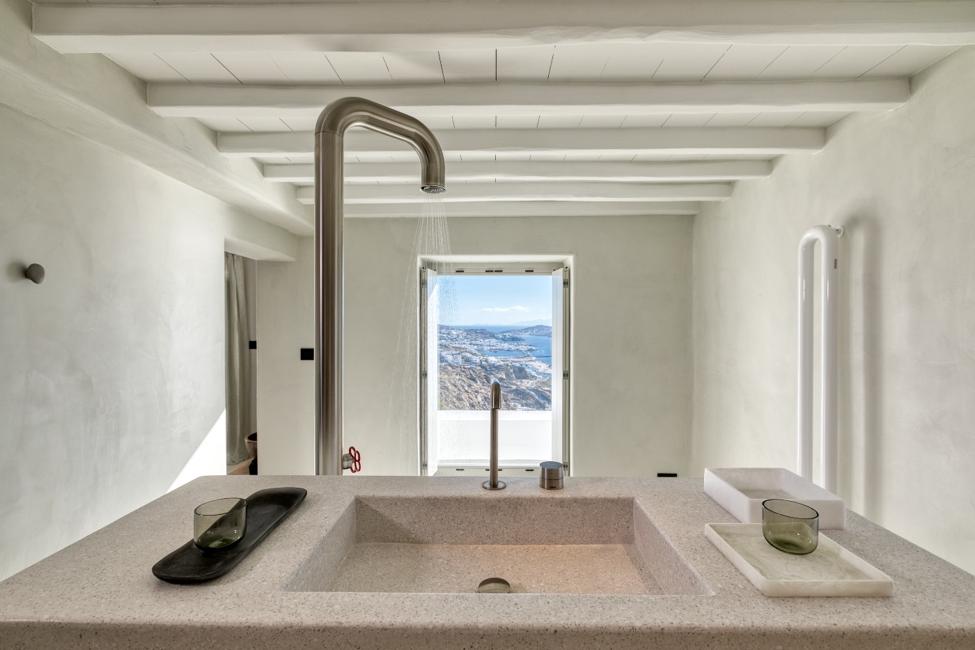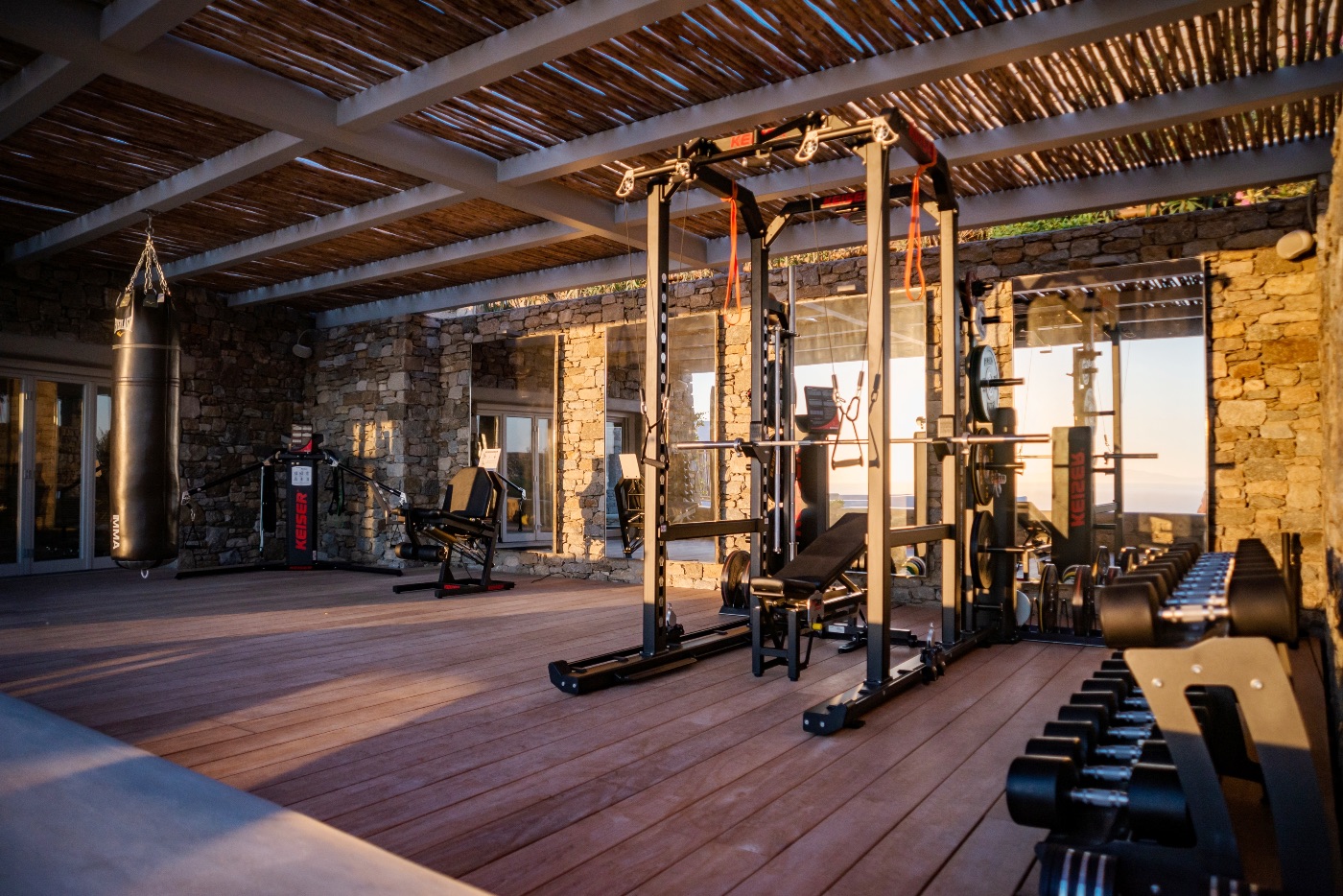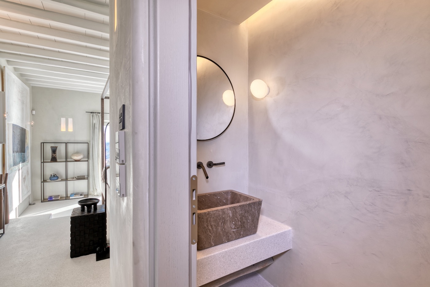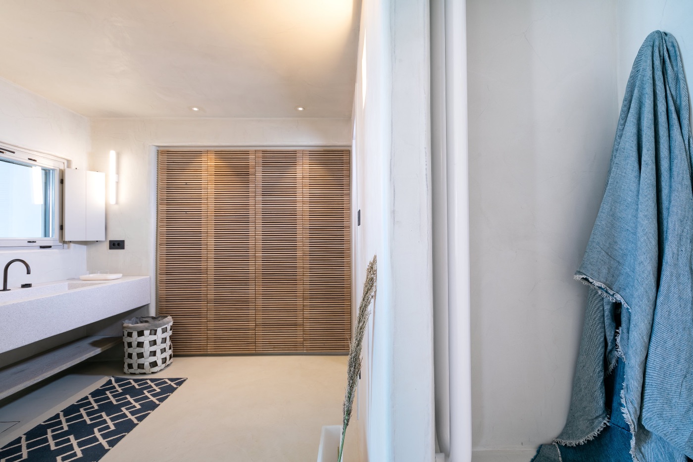 Villa Zeus expands on multiple levels. Guests enter from the highest level which hosts the parking area and leads to the upper level with the Hammam and gym facilities and the entrance to the first guest room (“Syros”) which features a mezzanine with an en suite double bedroom and a spacious wooden terrace with a built-in Jacuzzi (may be accessed from outside the bedroom too). The next level down (main/pool level) hosts the main outdoor area with the Infinity pool, the pool bar, a pool bathroom facility (shower and toilet) and the 2 main accommodation units on the left and right of the pool. The first unit hosts the kitchen and main living and dining area on the ground floor and 1 double bedroom (“Naxos”) on the first floor. Behind this unit is the Chef’s kitchen and staff facilities. The second unit hosts 2 double bedrooms (“Tinos” and “Andros”, optionally interconnected). Descending to the lower level, guests may find the bio garden on the left and enter a cave style passage on the right which exits to the guest houses area. This area hosts 5 independent guest houses with independent entrances (“Yaros”, “Baos”, “Rhenia”, “Delos”, “Paros”), a kitchenette for the guests of this level and the chapel. All guest houses are double except “Baos” which is single. In addition, “Delos” and “Rhenia” are optionally interconnected while “Rhenia” may also be set as a quadruple with the use of 2 roll-away pull-out beds. All units enjoy unobstructed sea/sunset views.