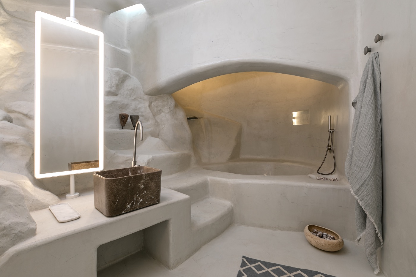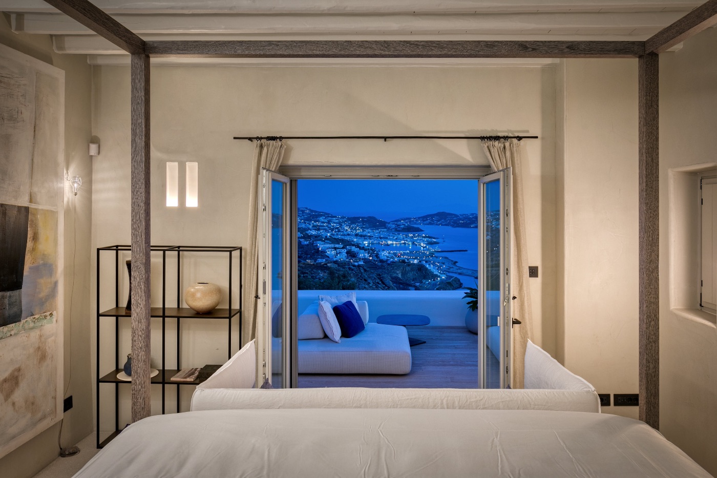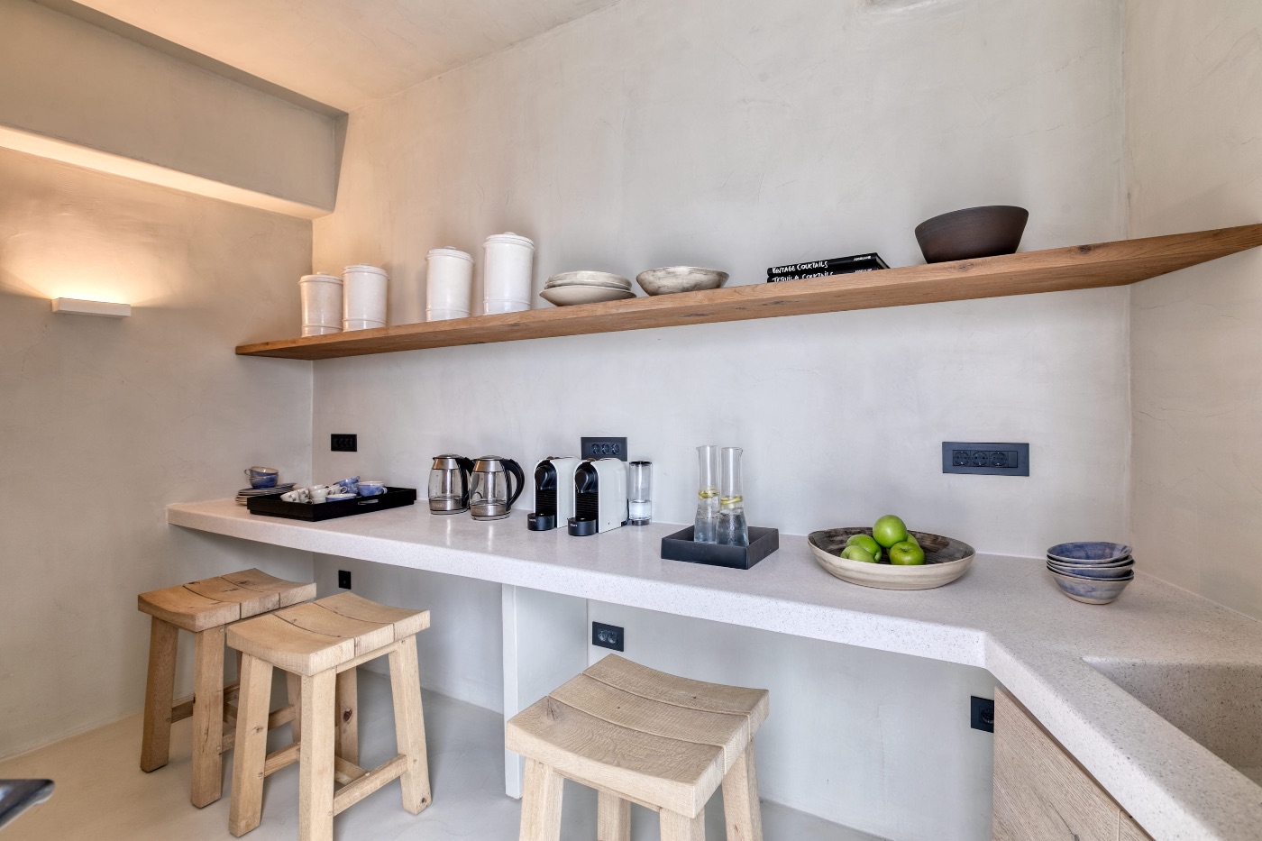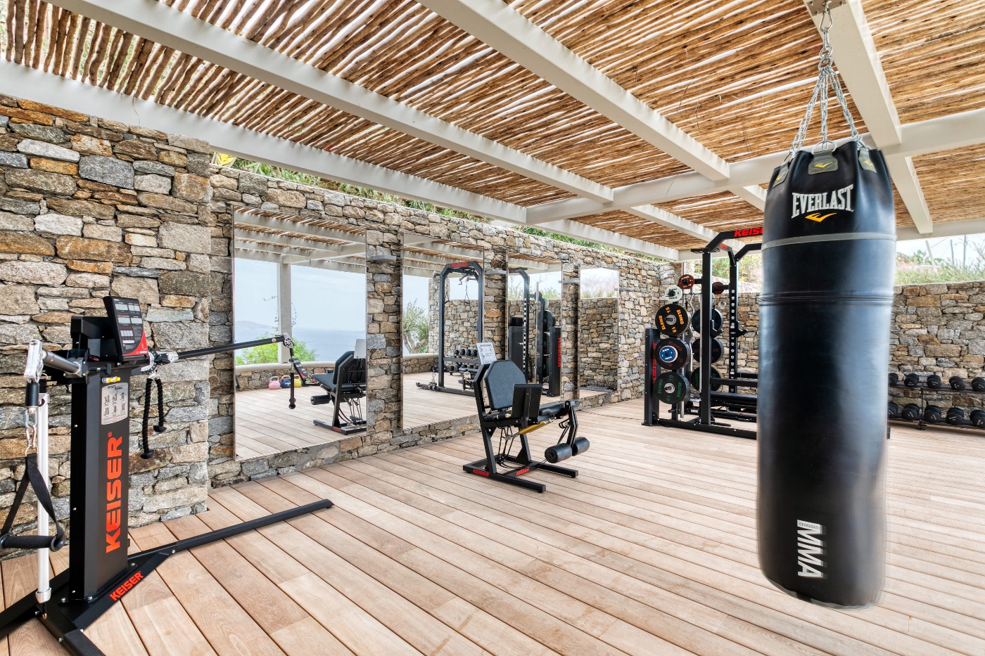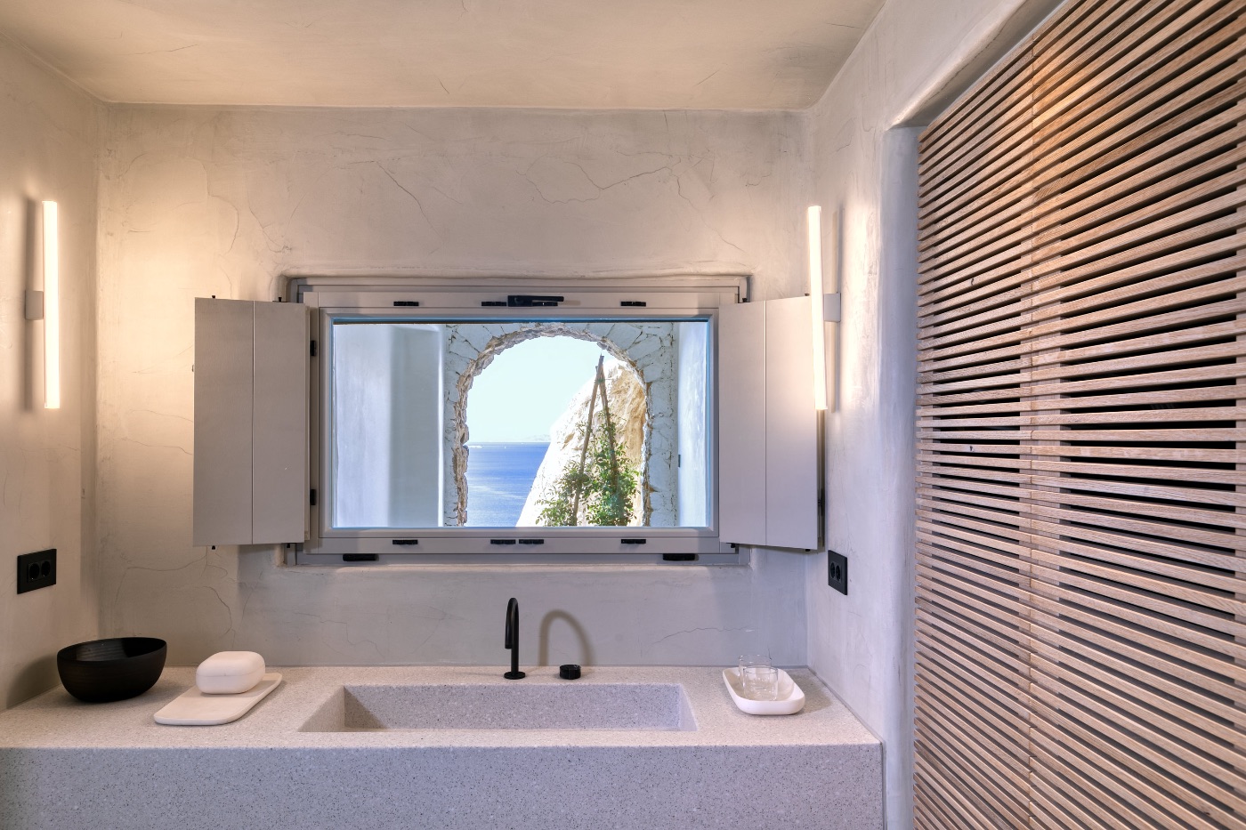 Villa Zeus expands on multiple levels. Guests enter from the highest level which hosts the parking area and leads to the upper level with the Hammam and gym facilities and the entrance to the first guest room (“Syros”) which features a mezzanine with an en suite double bedroom and a spacious wooden terrace with a built-in Jacuzzi (may be accessed from outside the bedroom too). The next level down (main/pool level) hosts the main outdoor area with the Infinity pool, the pool bar, a pool bathroom facility (shower and toilet) and the 2 main accommodation units on the left and right of the pool. The first unit hosts the kitchen and main living and dining area on the ground floor and 1 double bedroom (“Naxos”) on the first floor. Behind this unit is the Chef’s kitchen and staff facilities. The second unit hosts 2 double bedrooms (“Tinos” and “Andros”, optionally interconnected). Descending to the lower level, guests may find the bio garden on the left and enter a cave style passage on the right which exits to the guest houses area. This area hosts 5 independent guest houses with independent entrances (“Yaros”, “Baos”, “Rhenia”, “Delos”, “Paros”), a kitchenette for the guests of this level and the chapel. All guest houses are double except “Baos” which is single. In addition, “Delos” and “Rhenia” are optionally interconnected while “Rhenia” may also be set as a quadruple with the use of 2 roll-away pull-out beds. All units enjoy unobstructed sea/sunset views.