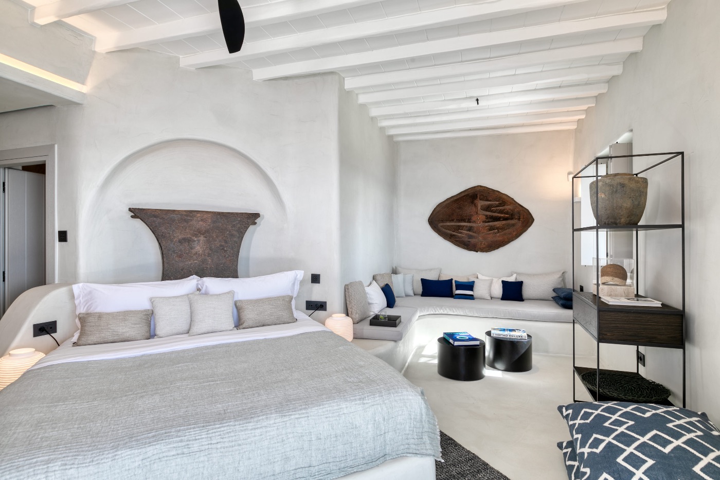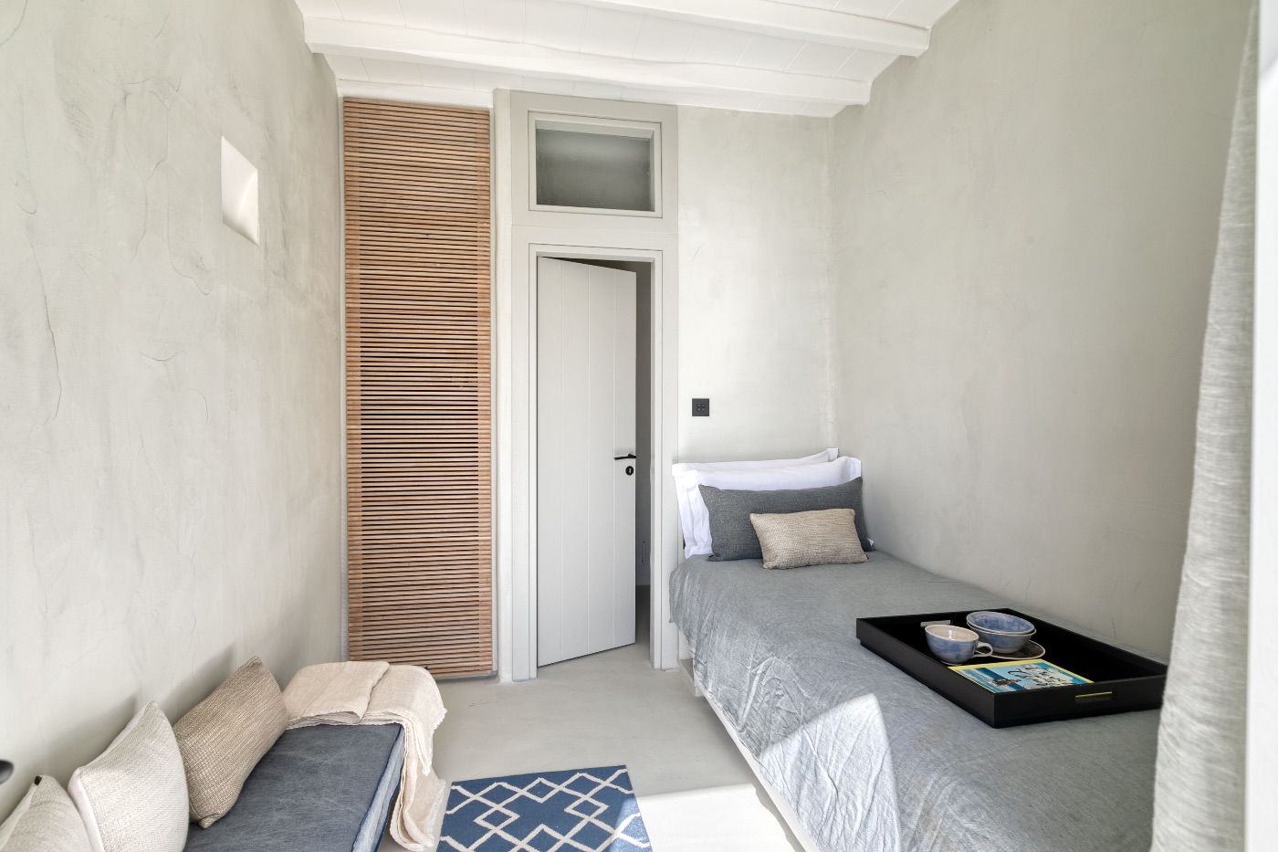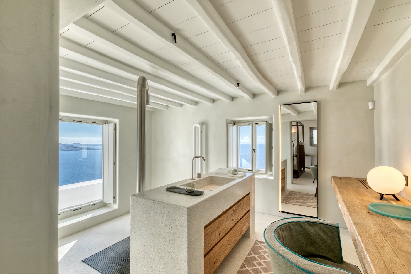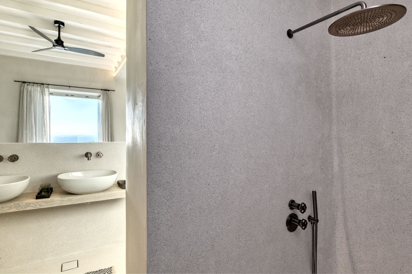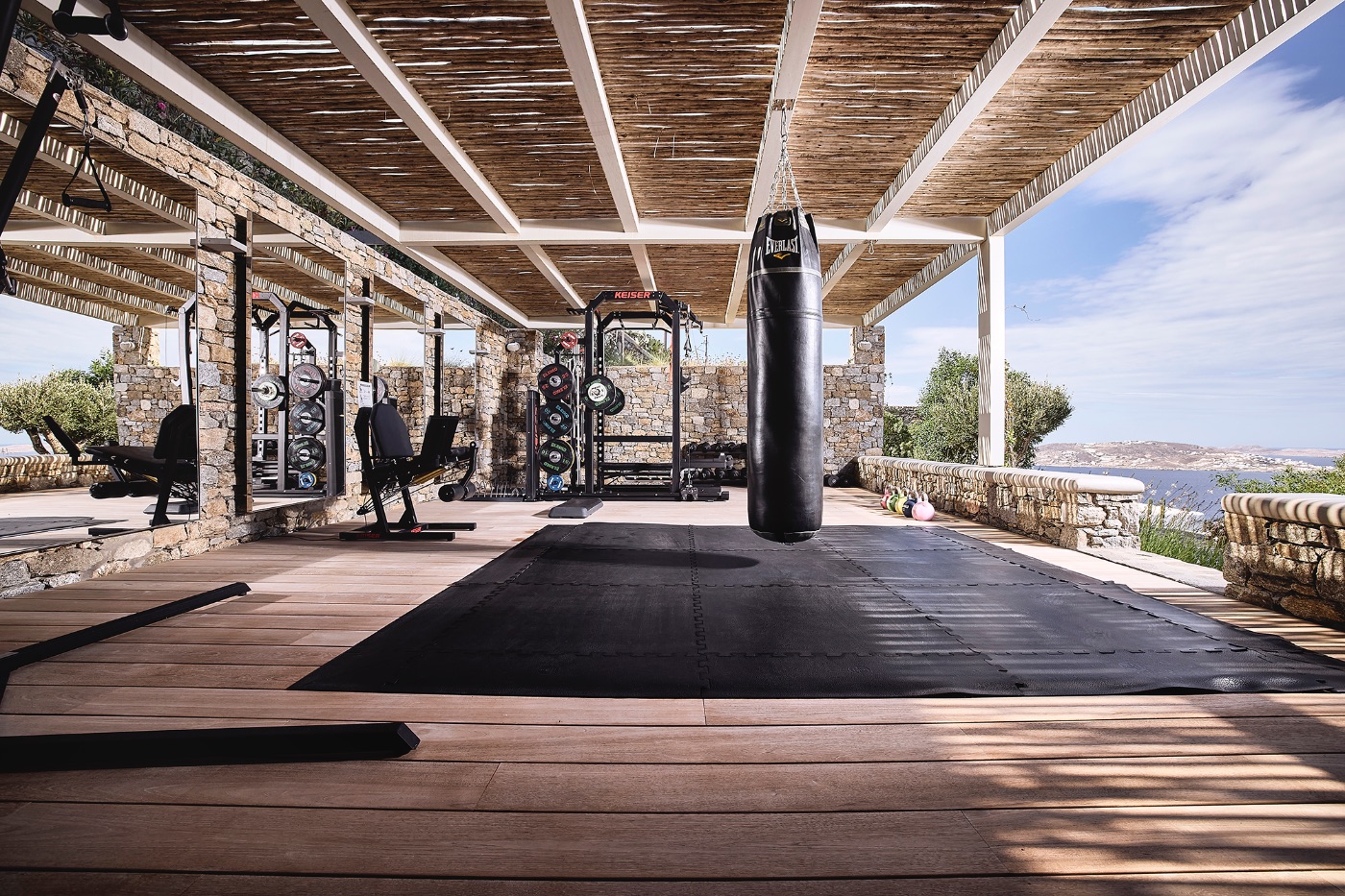 Villa Zeus expands on multiple levels. Guests enter from the highest level which hosts the parking area and leads to the upper level with the Hammam and gym facilities and the entrance to the first guest room (“Syros”) which features a mezzanine with an en suite double bedroom and a spacious wooden terrace with a built-in Jacuzzi (may be accessed from outside the bedroom too). The next level down (main/pool level) hosts the main outdoor area with the Infinity pool, the pool bar, a pool bathroom facility (shower and toilet) and the 2 main accommodation units on the left and right of the pool. The first unit hosts the kitchen and main living and dining area on the ground floor and 1 double bedroom (“Naxos”) on the first floor. Behind this unit is the Chef’s kitchen and staff facilities. The second unit hosts 2 double bedrooms (“Tinos” and “Andros”, optionally interconnected). Descending to the lower level, guests may find the bio garden on the left and enter a cave style passage on the right which exits to the guest houses area. This area hosts 5 independent guest houses with independent entrances (“Yaros”, “Baos”, “Rhenia”, “Delos”, “Paros”), a kitchenette for the guests of this level and the chapel. All guest houses are double except “Baos” which is single. In addition, “Delos” and “Rhenia” are optionally interconnected while “Rhenia” may also be set as a quadruple with the use of 2 roll-away pull-out beds. All units enjoy unobstructed sea/sunset views.