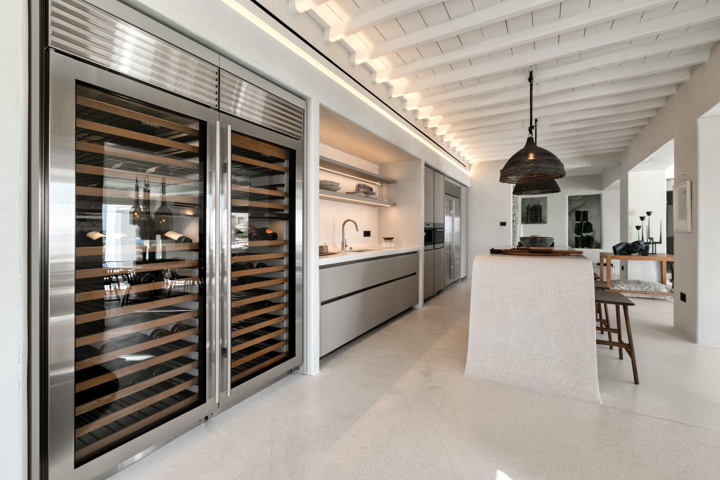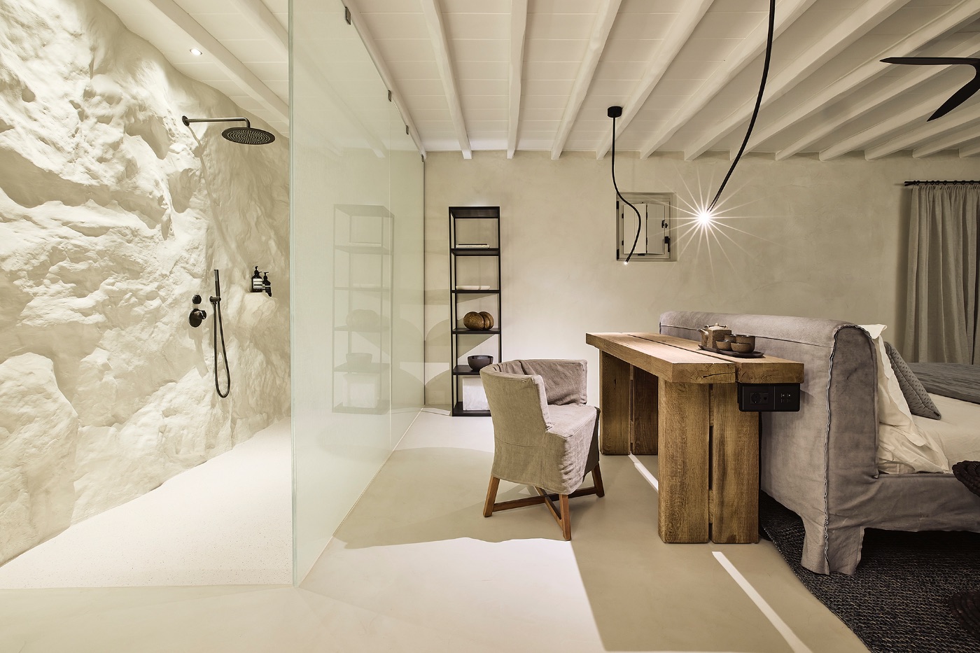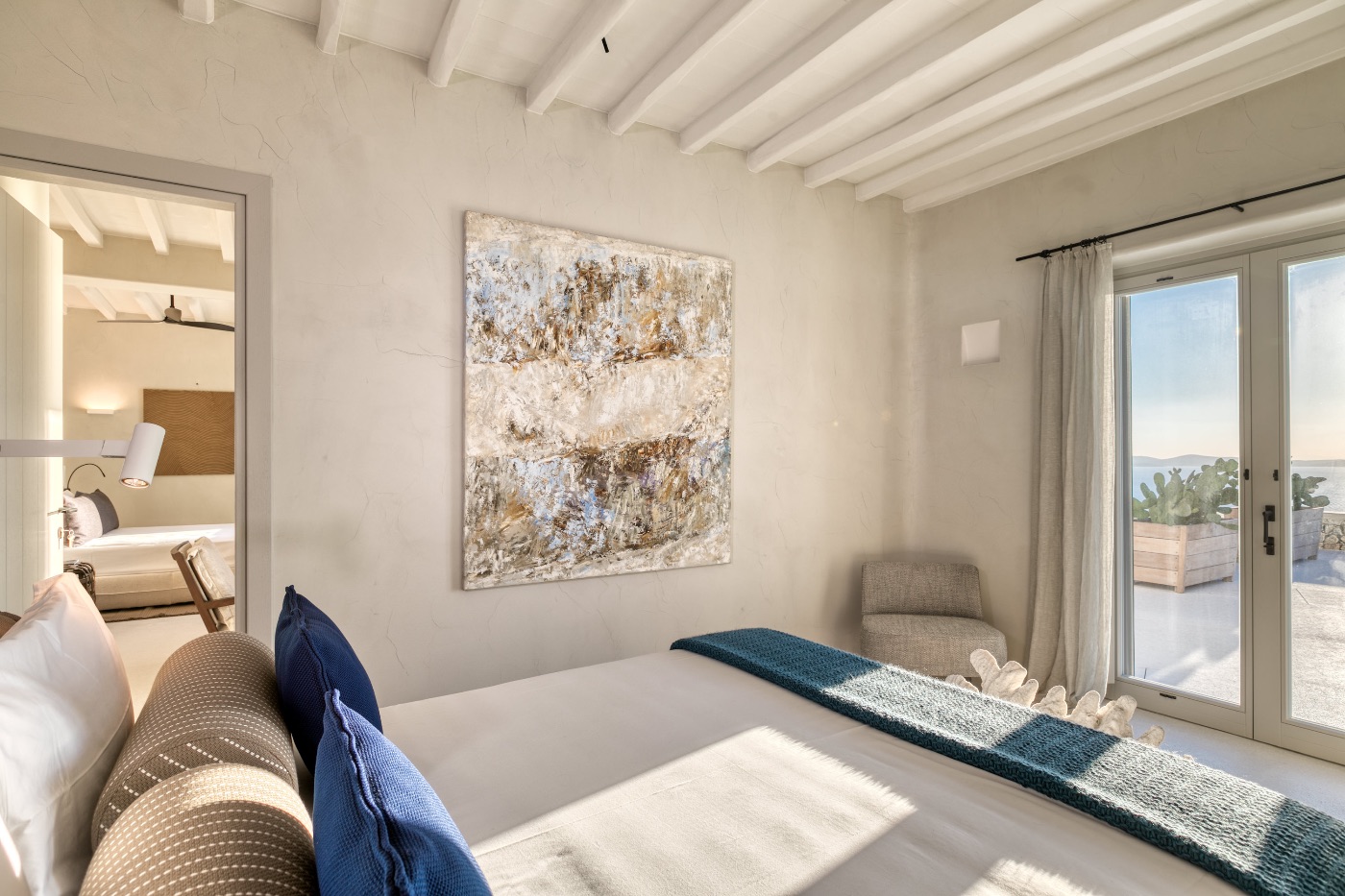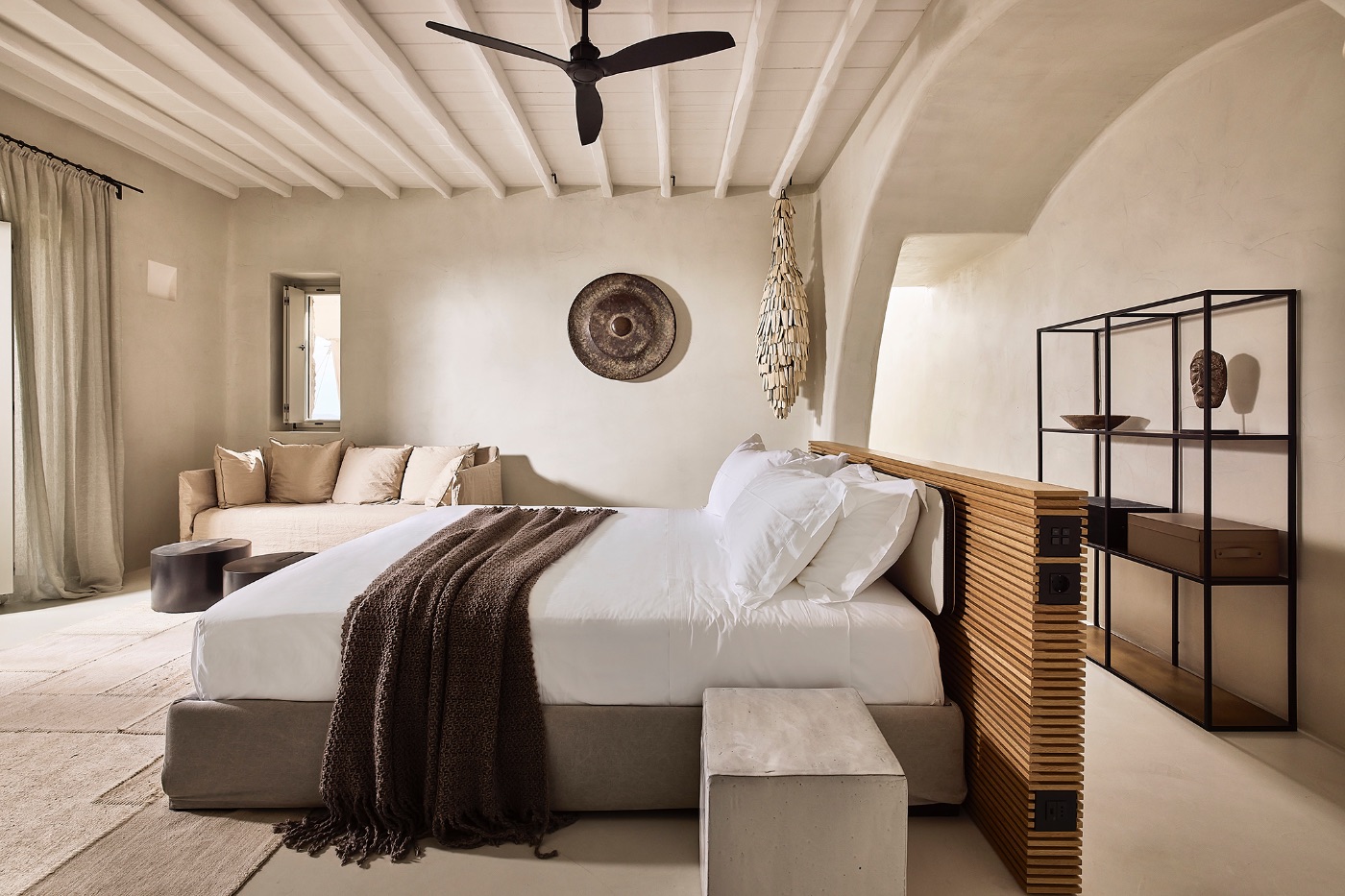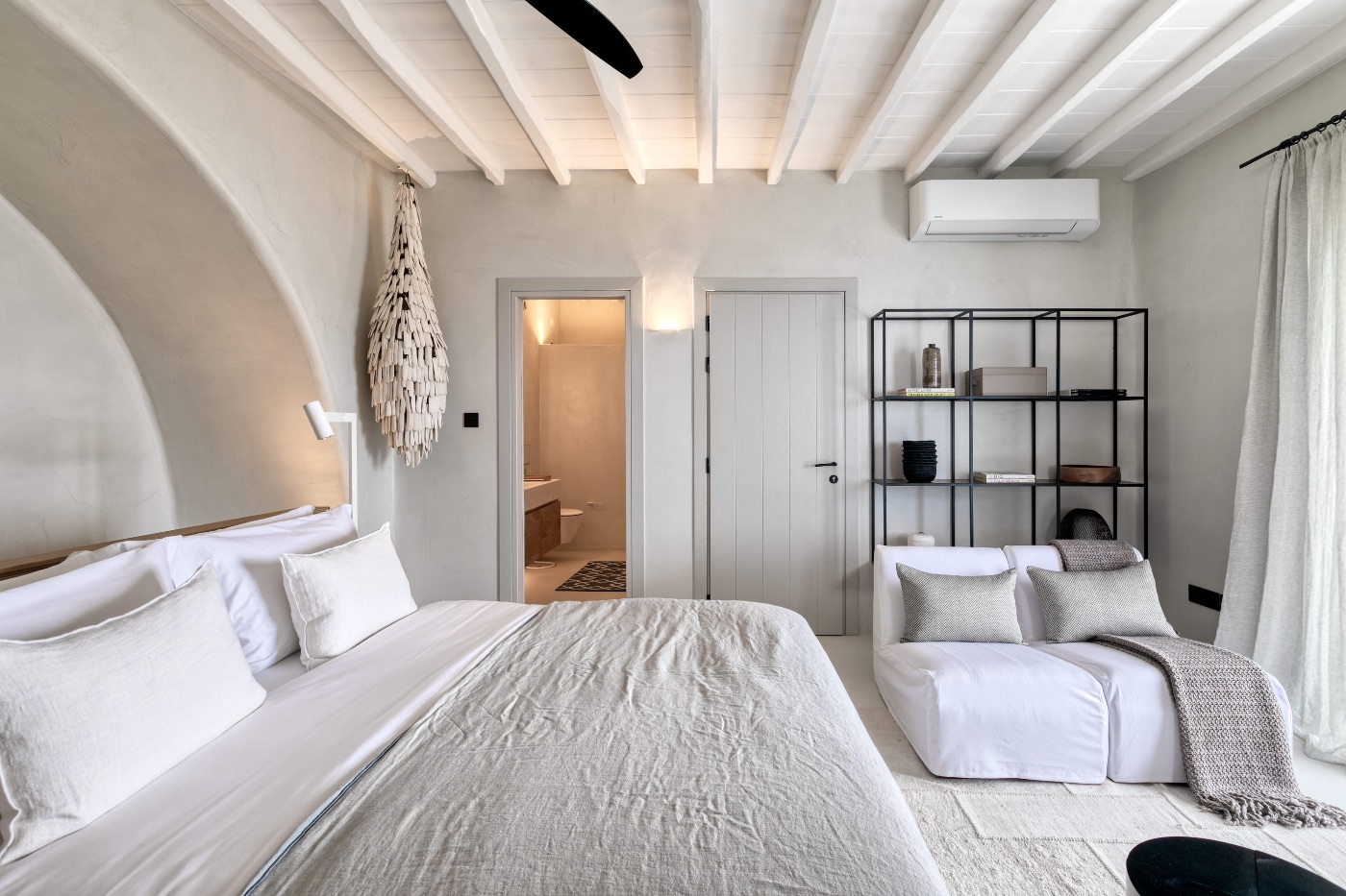 Villa Zeus expands on multiple levels. Guests enter from the highest level which hosts the parking area and leads to the upper level with the Hammam and gym facilities and the entrance to the first guest room (“Syros”) which features a mezzanine with an en suite double bedroom and a spacious wooden terrace with a built-in Jacuzzi (may be accessed from outside the bedroom too). The next level down (main/pool level) hosts the main outdoor area with the Infinity pool, the pool bar, a pool bathroom facility (shower and toilet) and the 2 main accommodation units on the left and right of the pool. The first unit hosts the kitchen and main living and dining area on the ground floor and 1 double bedroom (“Naxos”) on the first floor. Behind this unit is the Chef’s kitchen and staff facilities. The second unit hosts 2 double bedrooms (“Tinos” and “Andros”, optionally interconnected). Descending to the lower level, guests may find the bio garden on the left and enter a cave style passage on the right which exits to the guest houses area. This area hosts 5 independent guest houses with independent entrances (“Yaros”, “Baos”, “Rhenia”, “Delos”, “Paros”), a kitchenette for the guests of this level and the chapel. All guest houses are double except “Baos” which is single. In addition, “Delos” and “Rhenia” are optionally interconnected while “Rhenia” may also be set as a quadruple with the use of 2 roll-away pull-out beds. All units enjoy unobstructed sea/sunset views.