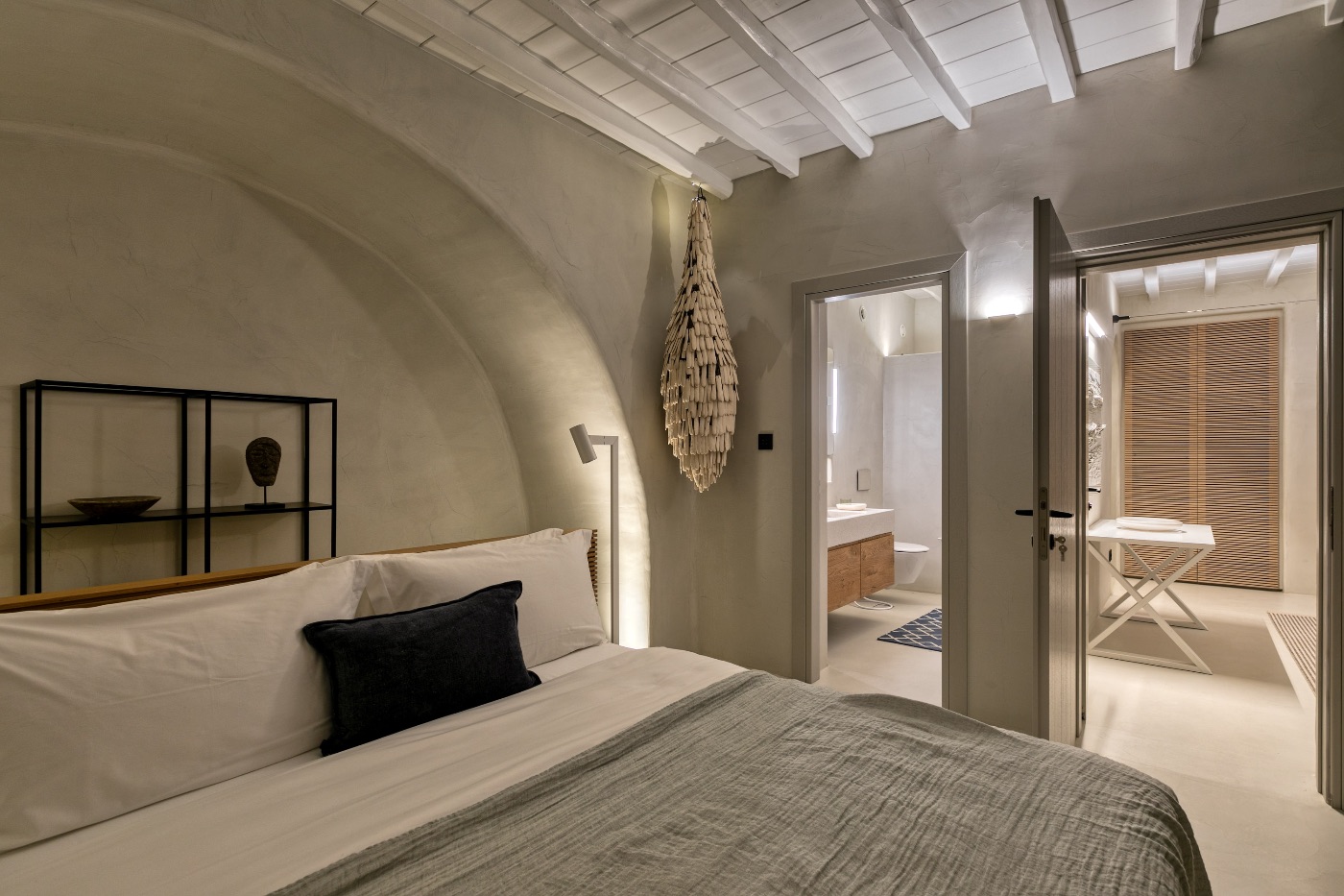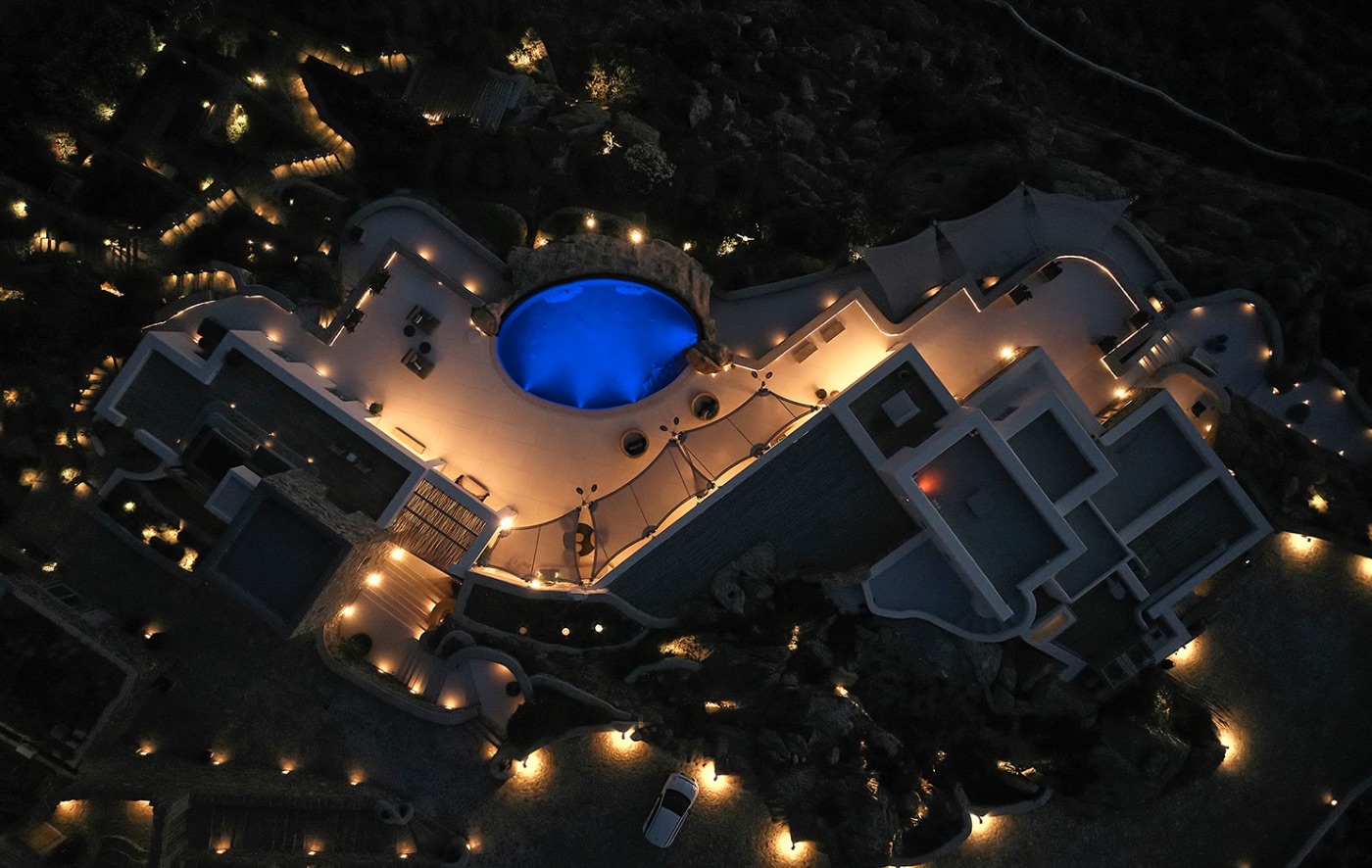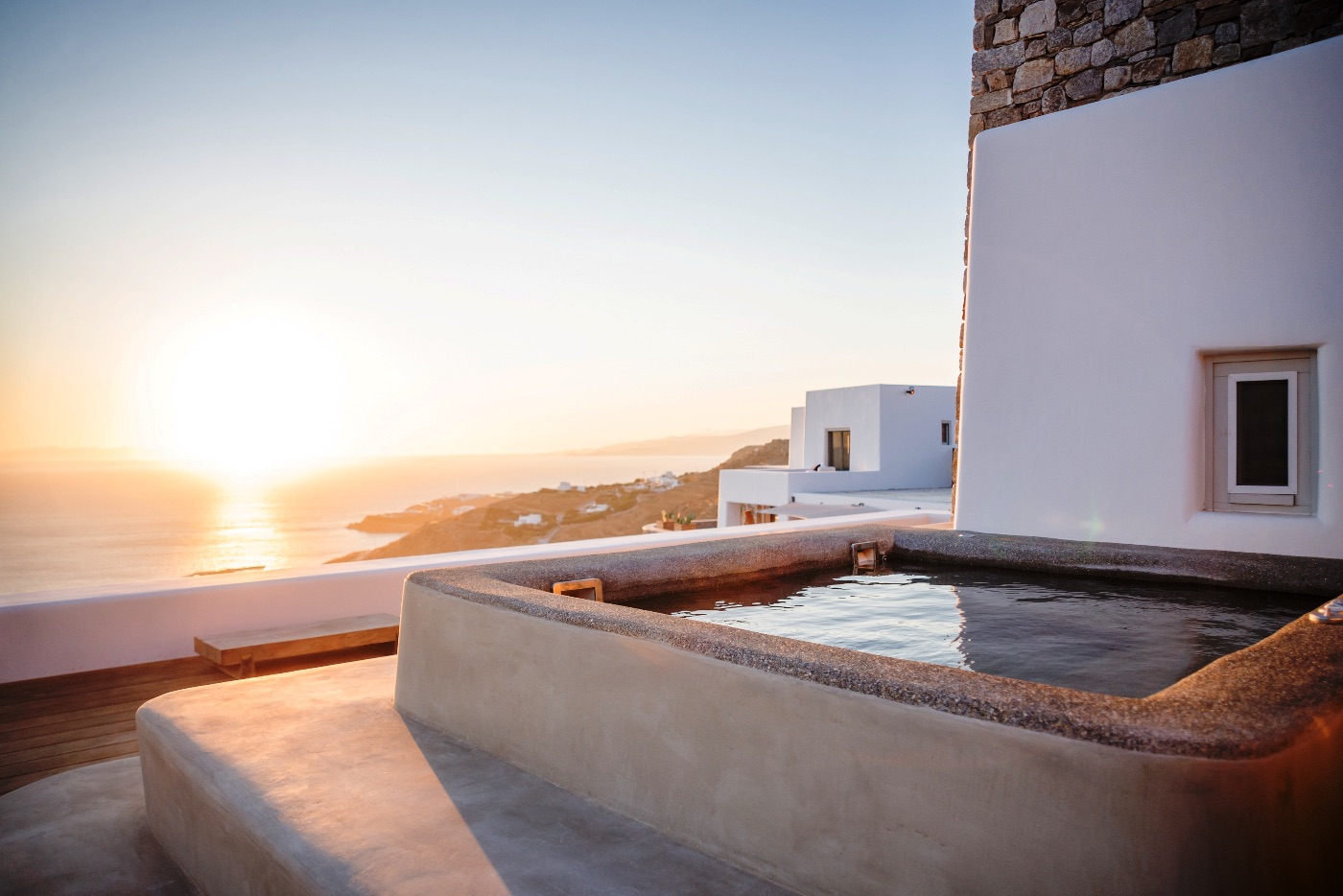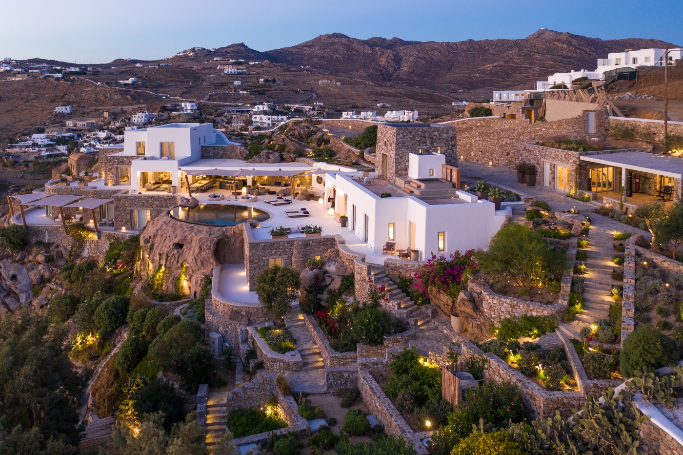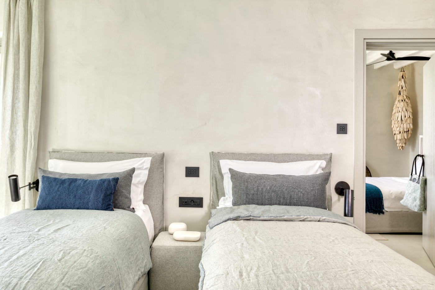 Villa Zeus expands on multiple levels. Guests enter from the highest level which hosts the parking area and leads to the upper level with the Hammam and gym facilities and the entrance to the first guest room (“Syros”) which features a mezzanine with an en suite double bedroom and a spacious wooden terrace with a built-in Jacuzzi (may be accessed from outside the bedroom too). The next level down (main/pool level) hosts the main outdoor area with the Infinity pool, the pool bar, a pool bathroom facility (shower and toilet) and the 2 main accommodation units on the left and right of the pool. The first unit hosts the kitchen and main living and dining area on the ground floor and 1 double bedroom (“Naxos”) on the first floor. Behind this unit is the Chef’s kitchen and staff facilities. The second unit hosts 2 double bedrooms (“Tinos” and “Andros”, optionally interconnected). Descending to the lower level, guests may find the bio garden on the left and enter a cave style passage on the right which exits to the guest houses area. This area hosts 5 independent guest houses with independent entrances (“Yaros”, “Baos”, “Rhenia”, “Delos”, “Paros”), a kitchenette for the guests of this level and the chapel. All guest houses are double except “Baos” which is single. In addition, “Delos” and “Rhenia” are optionally interconnected while “Rhenia” may also be set as a quadruple with the use of 2 roll-away pull-out beds. All units enjoy unobstructed sea/sunset views.