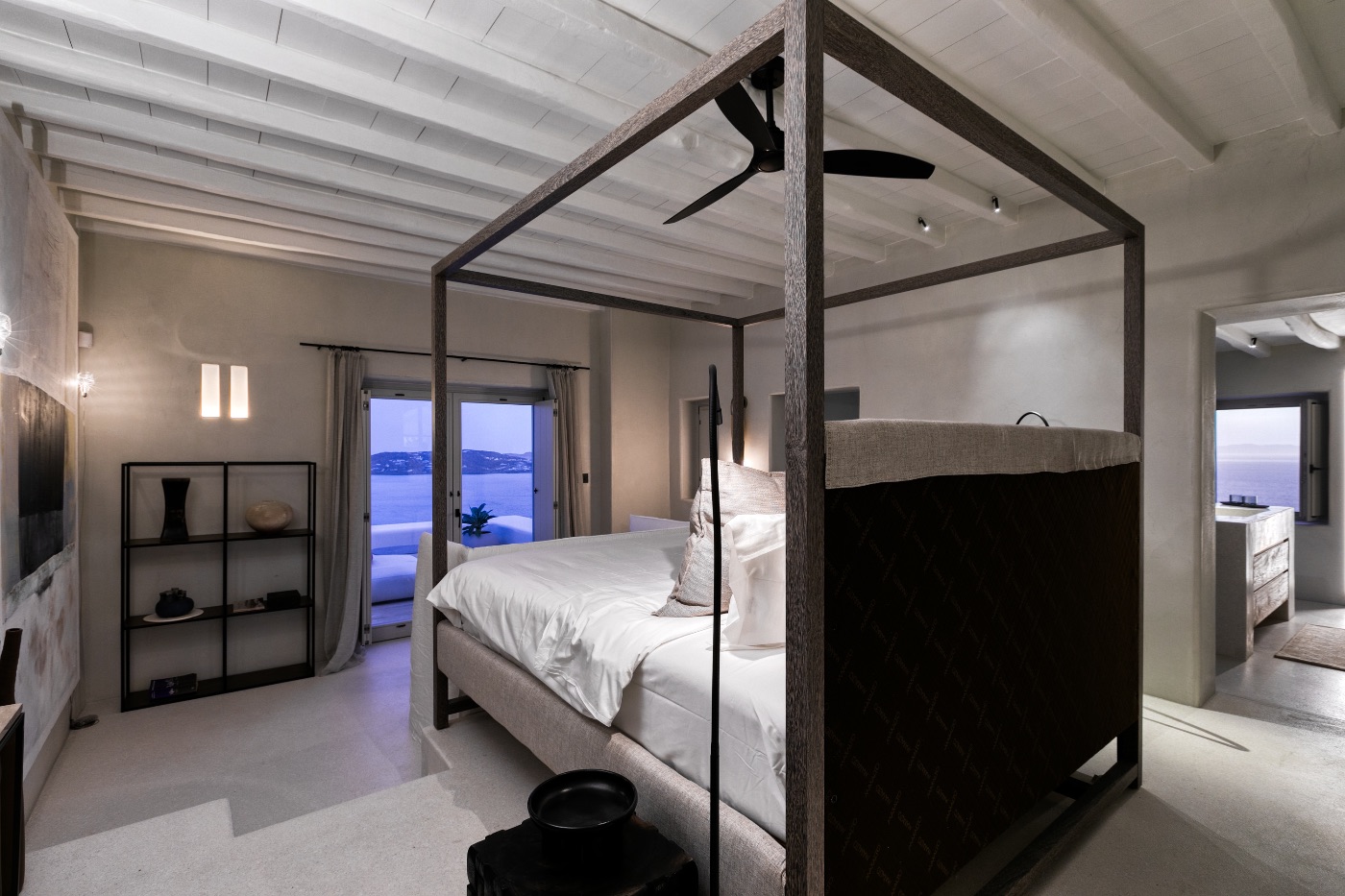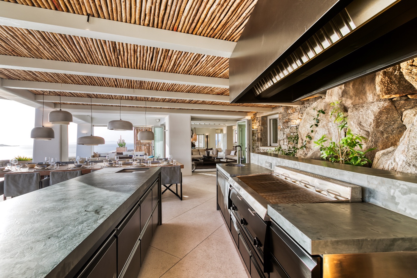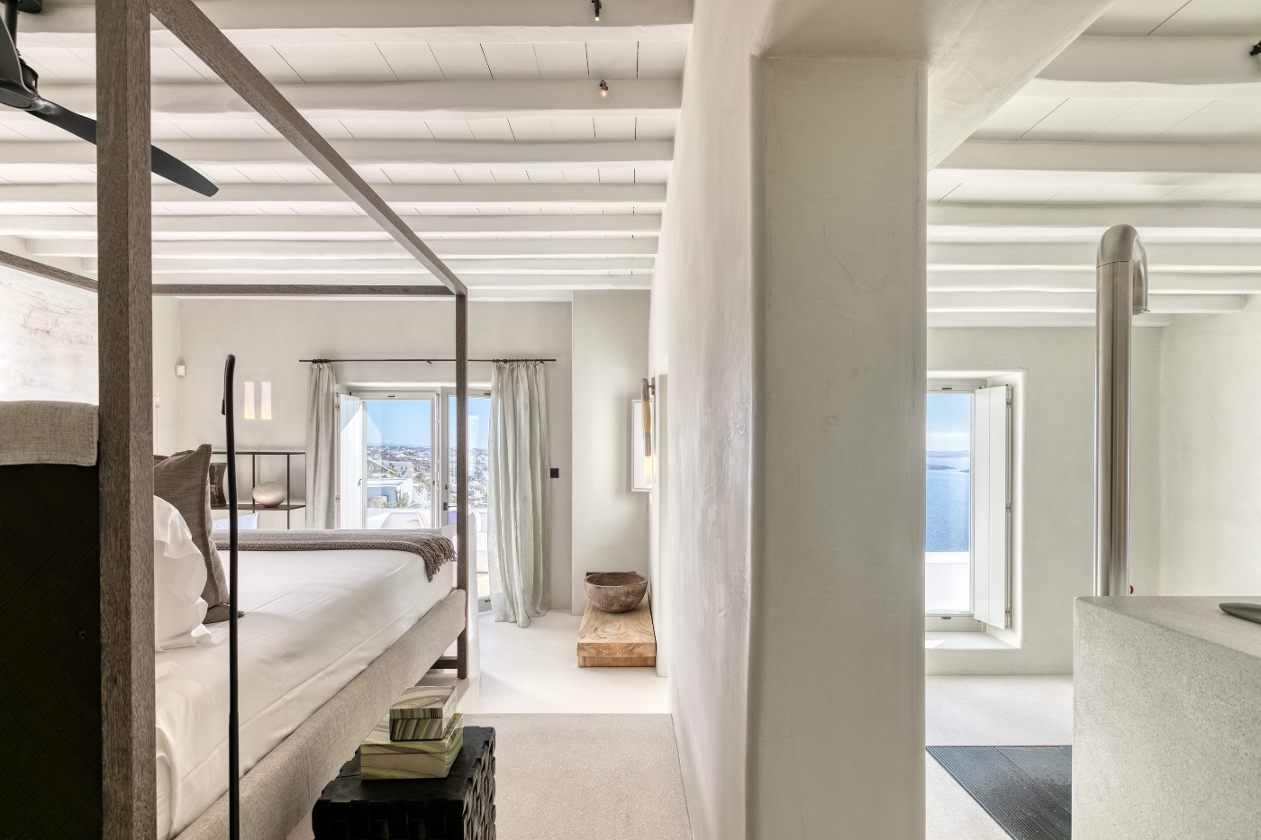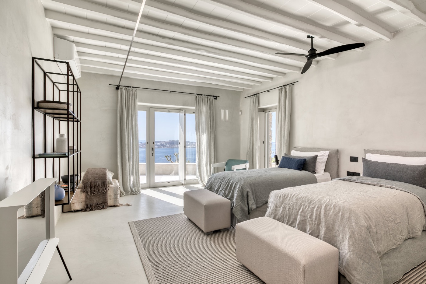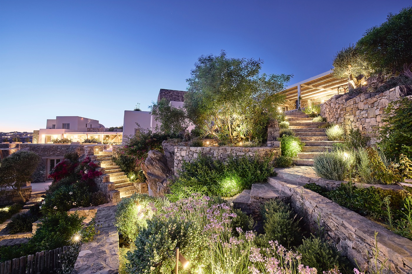Villa Zeus expands on multiple levels. Guests enter from the highest level which hosts the parking area and leads to the upper level with the Hammam and gym facilities and the entrance to the first guest room (“Syros”) which features a mezzanine with an en suite double bedroom and a spacious wooden terrace with a built-in Jacuzzi (may be accessed from outside the bedroom too). The next level down (main/pool level) hosts the main outdoor area with the Infinity pool, the pool bar, a pool bathroom facility (shower and toilet) and the 2 main accommodation units on the left and right of the pool. The first unit hosts the kitchen and main living and dining area on the ground floor and 1 double bedroom (“Naxos”) on the first floor. Behind this unit is the Chef’s kitchen and staff facilities. The second unit hosts 2 double bedrooms (“Tinos” and “Andros”, optionally interconnected). Descending to the lower level, guests may find the bio garden on the left and enter a cave style passage on the right which exits to the guest houses area. This area hosts 5 independent guest houses with independent entrances (“Yaros”, “Baos”, “Rhenia”, “Delos”, “Paros”), a kitchenette for the guests of this level and the chapel. All guest houses are double except “Baos” which is single. In addition, “Delos” and “Rhenia” are optionally interconnected while “Rhenia” may also be set as a quadruple with the use of 2 roll-away pull-out beds. All units enjoy unobstructed sea/sunset views.