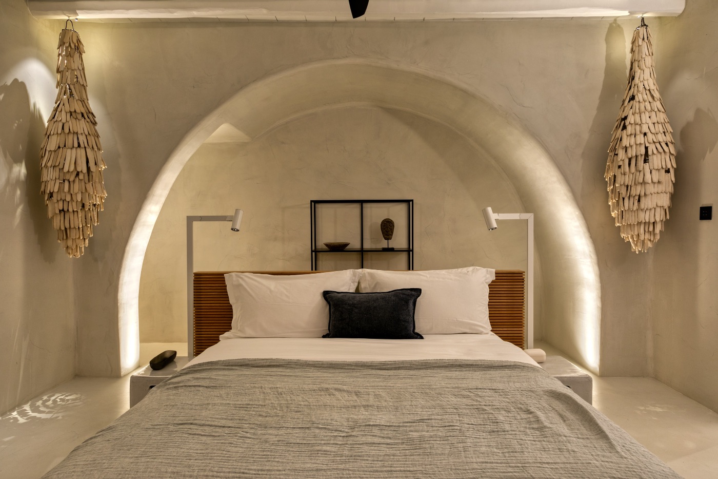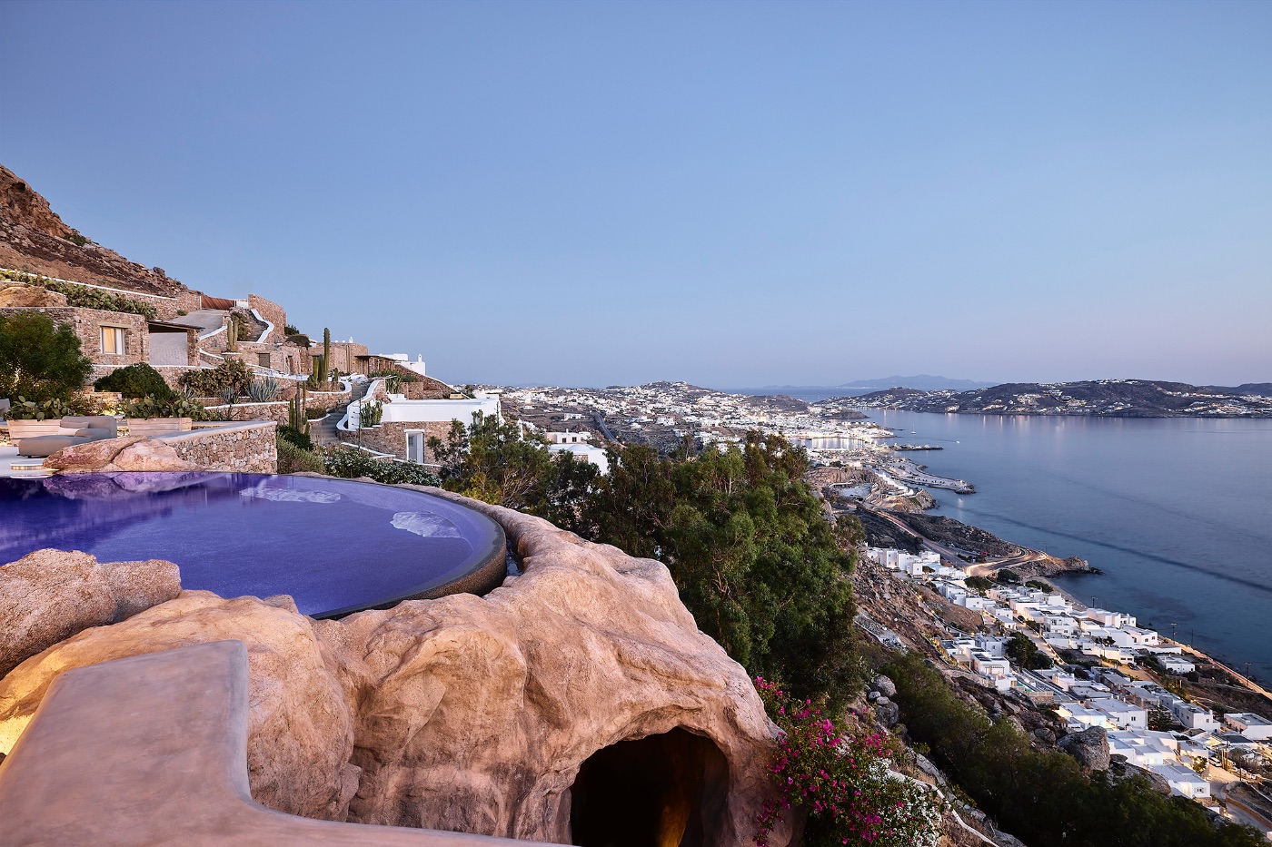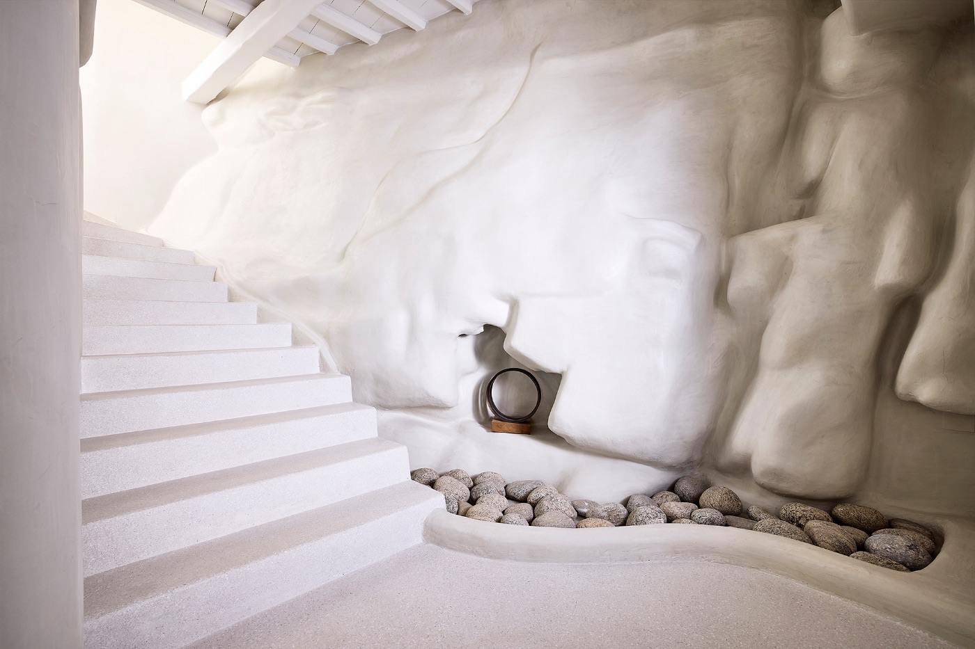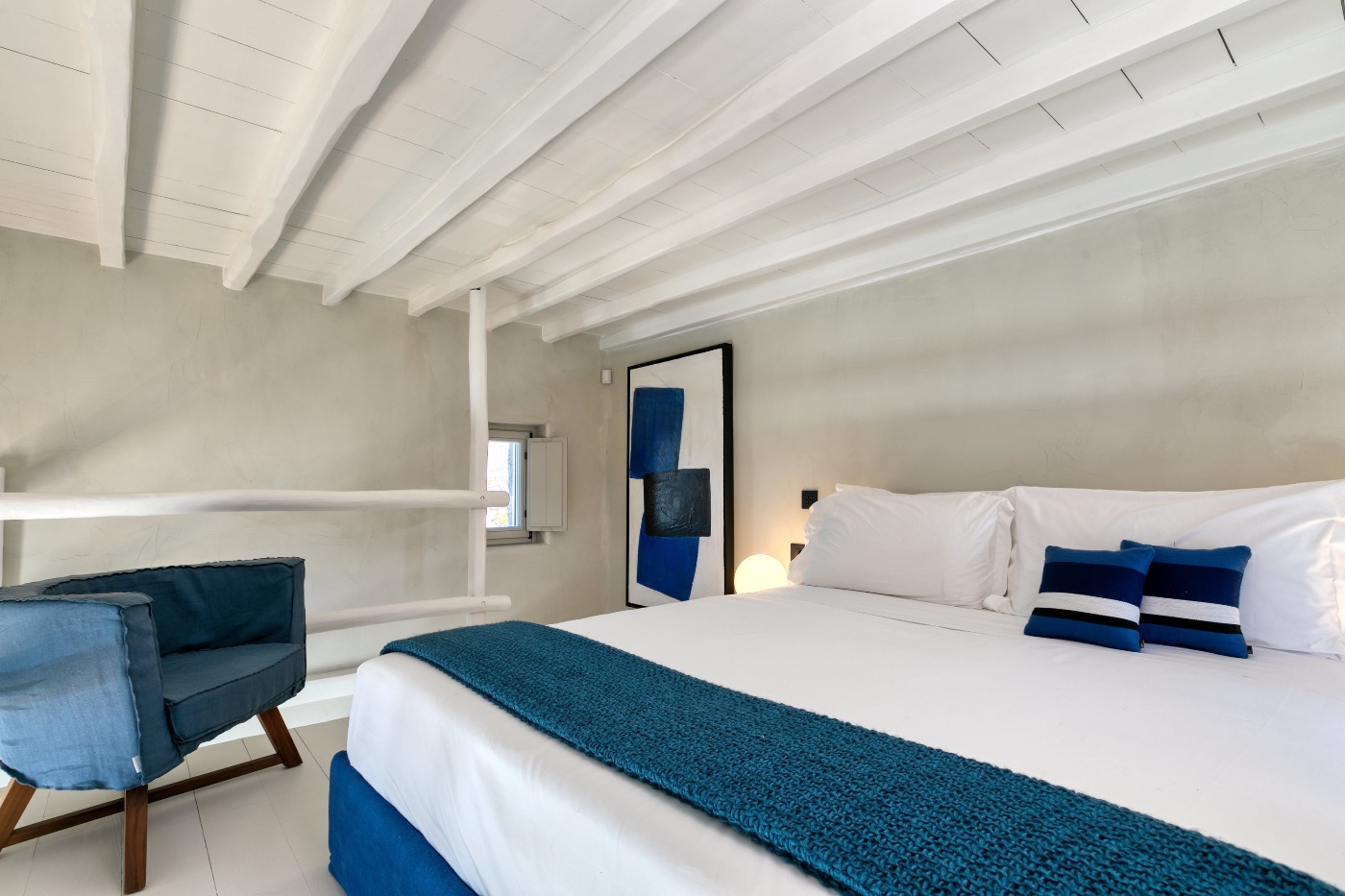 Villa Zeus expands on multiple levels. Guests enter from the highest level which hosts the parking area and leads to the upper level with the Hammam and gym facilities and the entrance to the first guest room (“Syros”) which features a mezzanine with an en suite double bedroom and a spacious wooden terrace with a built-in Jacuzzi (may be accessed from outside the bedroom too). The next level down (main/pool level) hosts the main outdoor area with the Infinity pool, the pool bar, a pool bathroom facility (shower and toilet) and the 2 main accommodation units on the left and right of the pool. The first unit hosts the kitchen and main living and dining area on the ground floor and 1 double bedroom (“Naxos”) on the first floor. Behind this unit is the Chef’s kitchen and staff facilities. The second unit hosts 2 double bedrooms (“Tinos” and “Andros”, optionally interconnected). Descending to the lower level, guests may find the bio garden on the left and enter a cave style passage on the right which exits to the guest houses area. This area hosts 5 independent guest houses with independent entrances (“Yaros”, “Baos”, “Rhenia”, “Delos”, “Paros”), a kitchenette for the guests of this level and the chapel. All guest houses are double except “Baos” which is single. In addition, “Delos” and “Rhenia” are optionally interconnected while “Rhenia” may also be set as a quadruple with the use of 2 roll-away pull-out beds. All units enjoy unobstructed sea/sunset views.