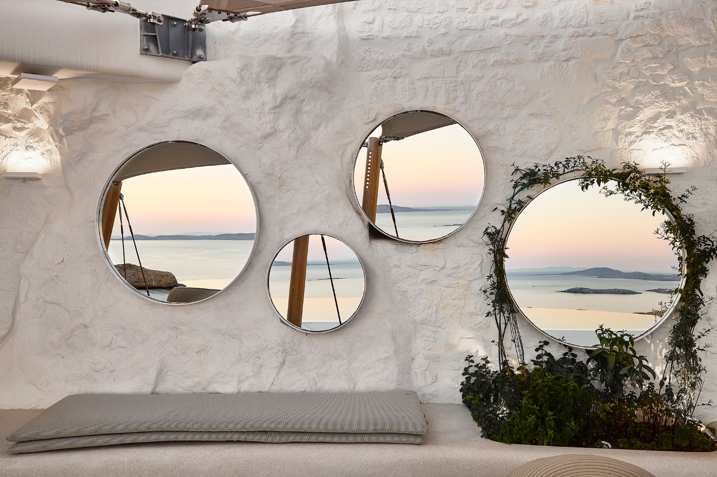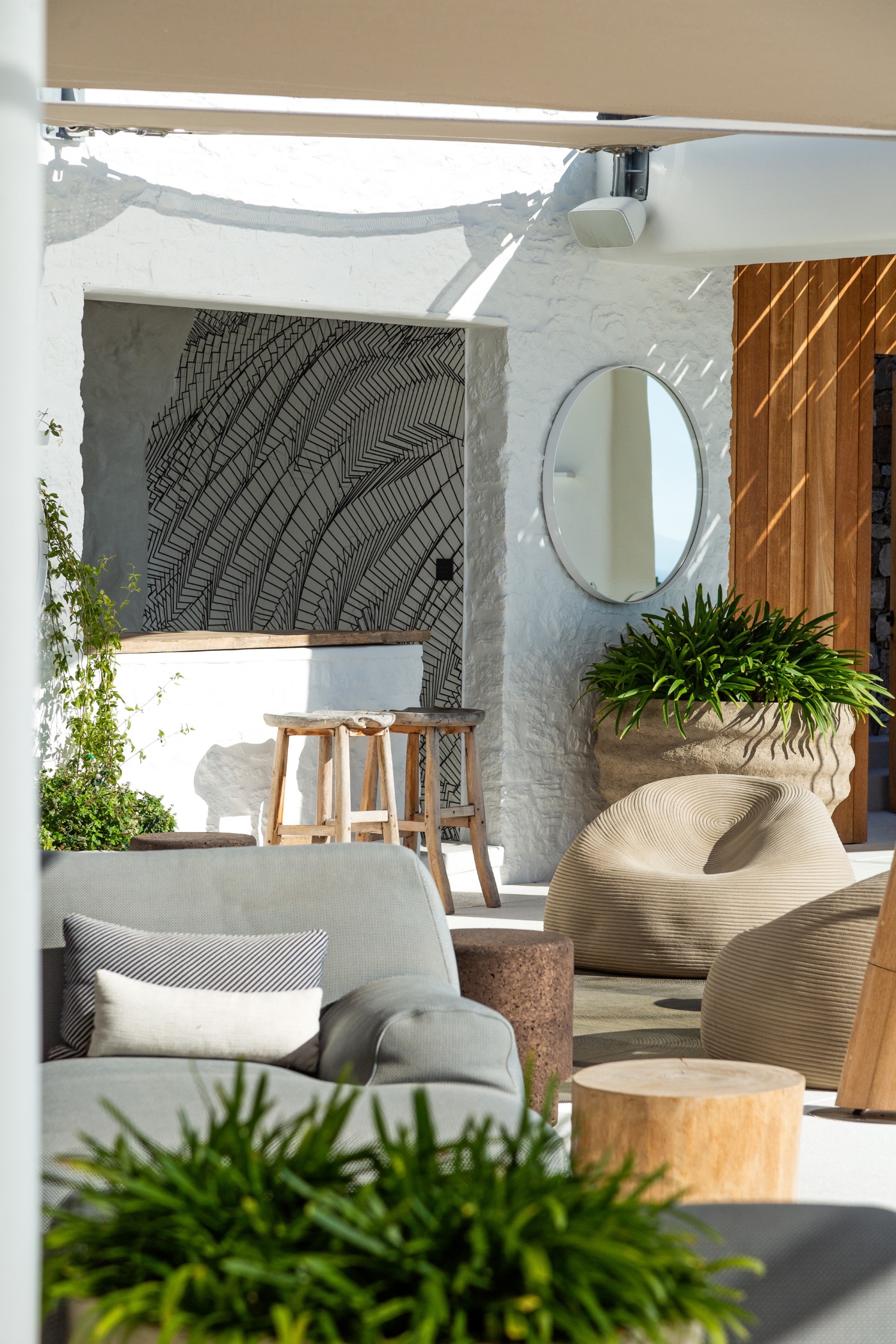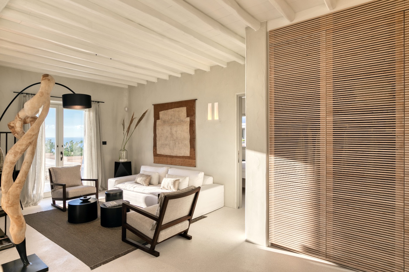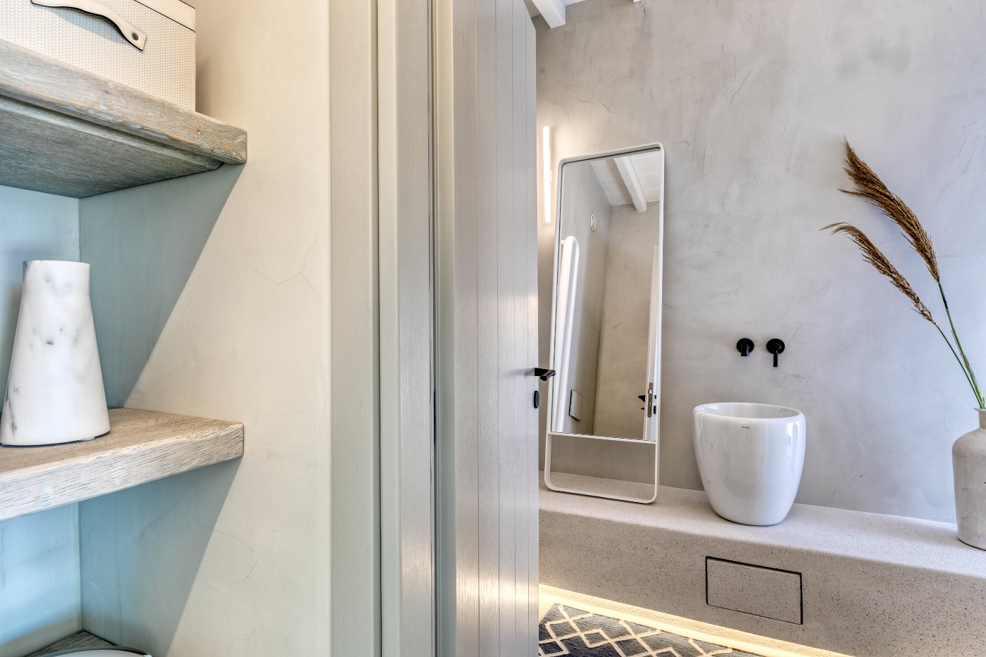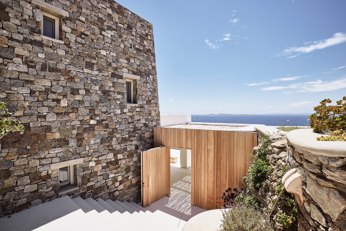 Villa Zeus expands on multiple levels. Guests enter from the highest level which hosts the parking area and leads to the upper level with the Hammam and gym facilities and the entrance to the first guest room (“Syros”) which features a mezzanine with an en suite double bedroom and a spacious wooden terrace with a built-in Jacuzzi (may be accessed from outside the bedroom too). The next level down (main/pool level) hosts the main outdoor area with the Infinity pool, the pool bar, a pool bathroom facility (shower and toilet) and the 2 main accommodation units on the left and right of the pool. The first unit hosts the kitchen and main living and dining area on the ground floor and 1 double bedroom (“Naxos”) on the first floor. Behind this unit is the Chef’s kitchen and staff facilities. The second unit hosts 2 double bedrooms (“Tinos” and “Andros”, optionally interconnected). Descending to the lower level, guests may find the bio garden on the left and enter a cave style passage on the right which exits to the guest houses area. This area hosts 5 independent guest houses with independent entrances (“Yaros”, “Baos”, “Rhenia”, “Delos”, “Paros”), a kitchenette for the guests of this level and the chapel. All guest houses are double except “Baos” which is single. In addition, “Delos” and “Rhenia” are optionally interconnected while “Rhenia” may also be set as a quadruple with the use of 2 roll-away pull-out beds. All units enjoy unobstructed sea/sunset views.