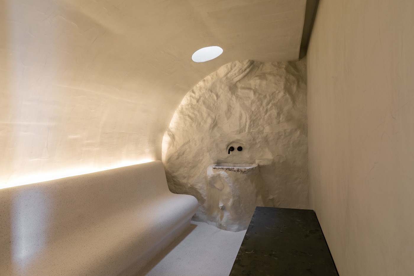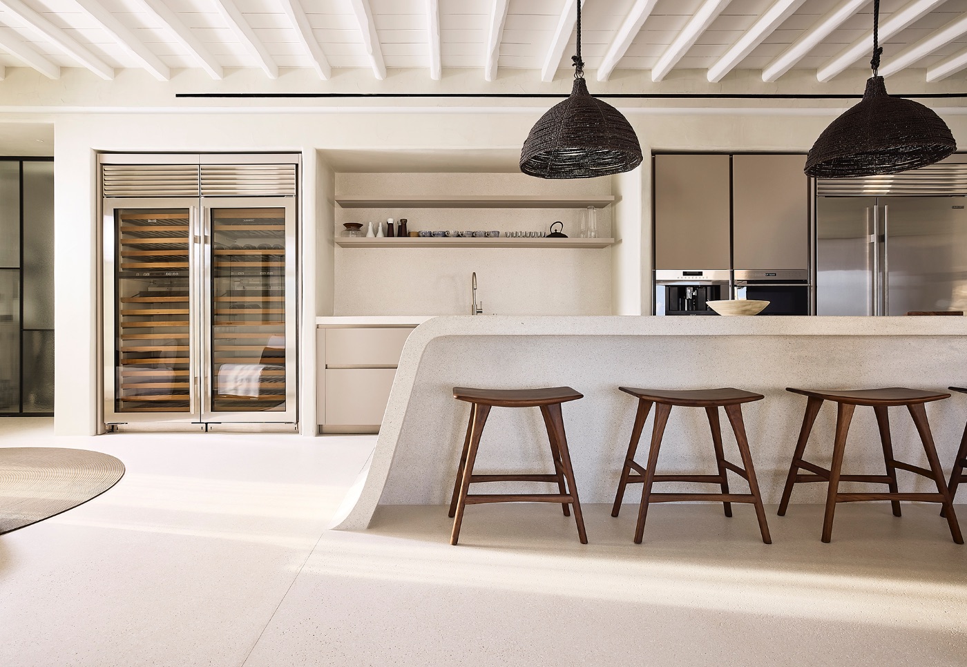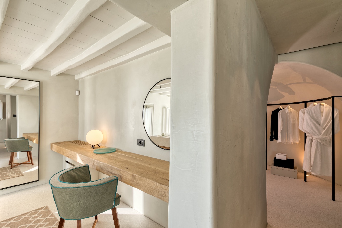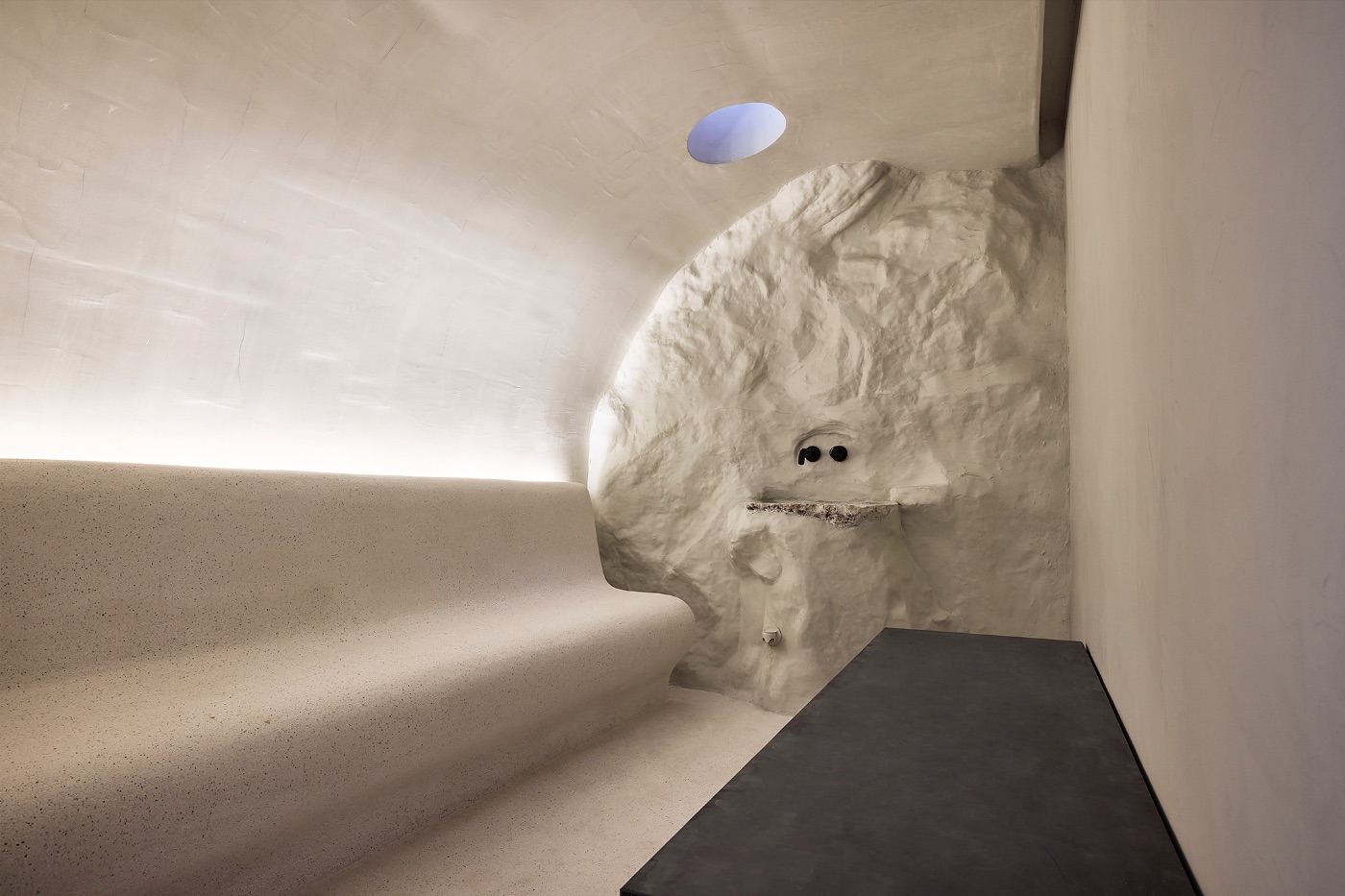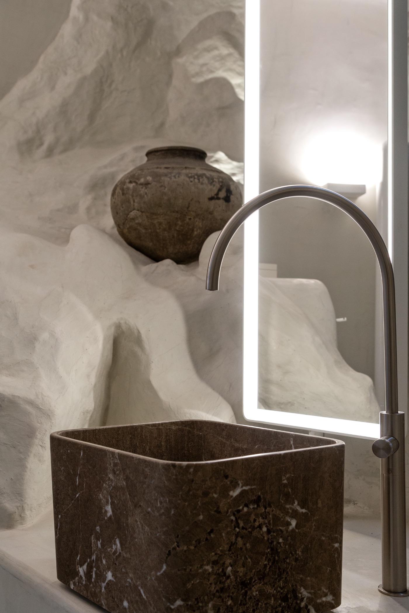 Villa Zeus expands on multiple levels. Guests enter from the highest level which hosts the parking area and leads to the upper level with the Hammam and gym facilities and the entrance to the first guest room (“Syros”) which features a mezzanine with an en suite double bedroom and a spacious wooden terrace with a built-in Jacuzzi (may be accessed from outside the bedroom too). The next level down (main/pool level) hosts the main outdoor area with the Infinity pool, the pool bar, a pool bathroom facility (shower and toilet) and the 2 main accommodation units on the left and right of the pool. The first unit hosts the kitchen and main living and dining area on the ground floor and 1 double bedroom (“Naxos”) on the first floor. Behind this unit is the Chef’s kitchen and staff facilities. The second unit hosts 2 double bedrooms (“Tinos” and “Andros”, optionally interconnected). Descending to the lower level, guests may find the bio garden on the left and enter a cave style passage on the right which exits to the guest houses area. This area hosts 5 independent guest houses with independent entrances (“Yaros”, “Baos”, “Rhenia”, “Delos”, “Paros”), a kitchenette for the guests of this level and the chapel. All guest houses are double except “Baos” which is single. In addition, “Delos” and “Rhenia” are optionally interconnected while “Rhenia” may also be set as a quadruple with the use of 2 roll-away pull-out beds. All units enjoy unobstructed sea/sunset views.